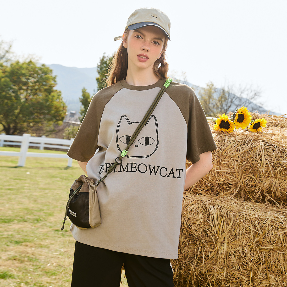 夏季撞色拼接插肩袖短袖卡通印花休闲百搭女式T恤 425437