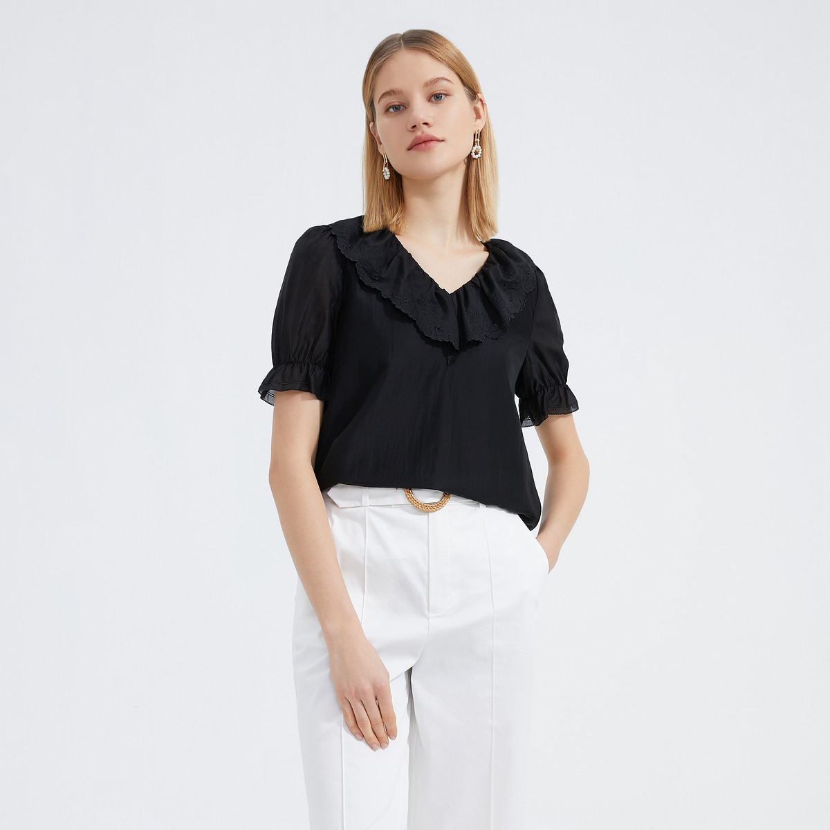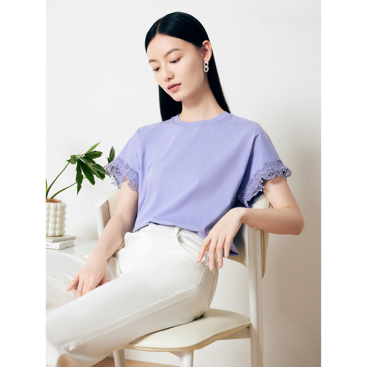 玖姿旗下安娜蔻系列轻熟休闲风直筒蕾丝纯色短袖套头T恤女夏季 440140