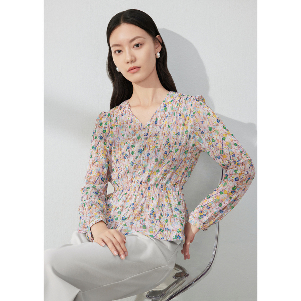 JZ玖姿度假风碎花女装春季法式V领网纱套头衫 082956
