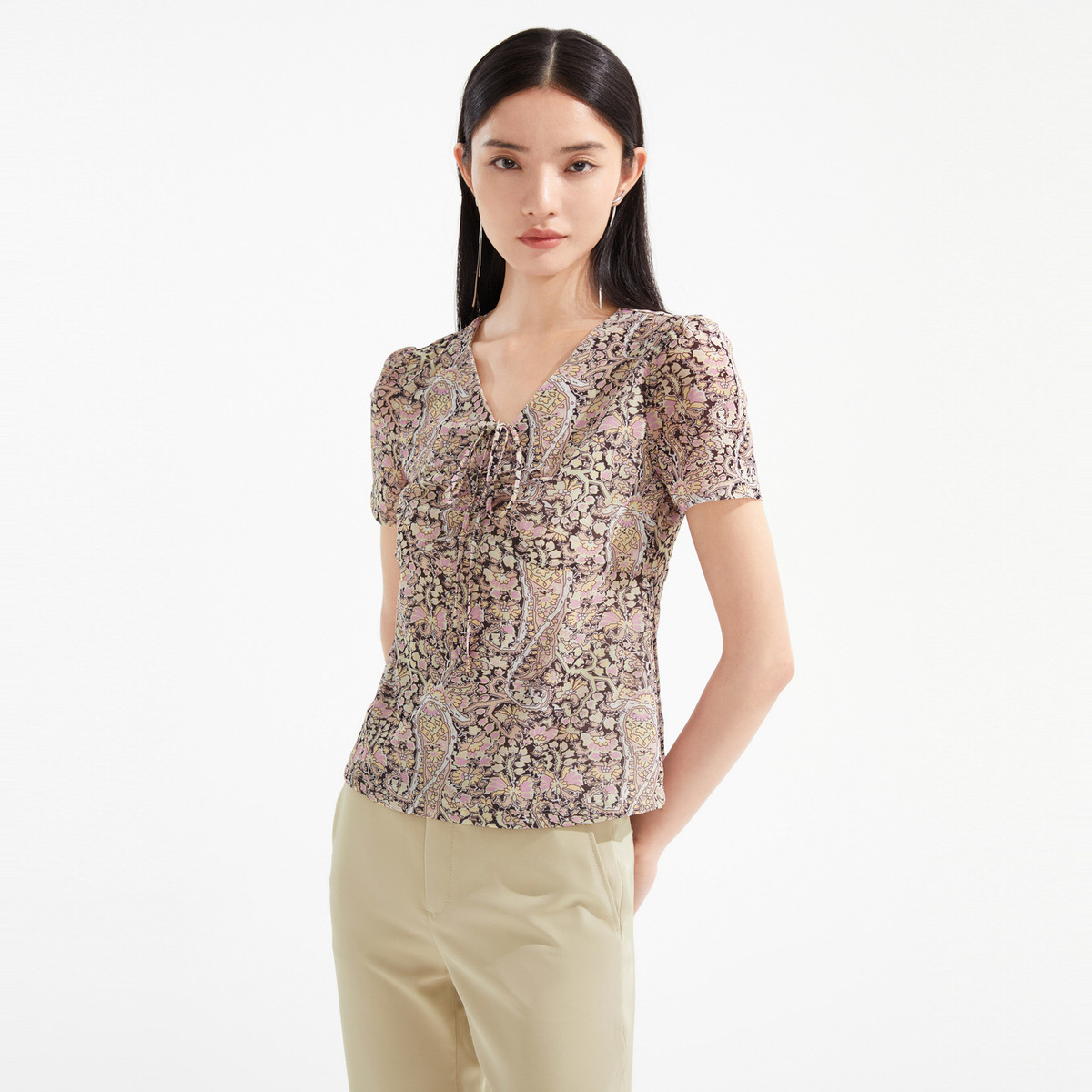 玖姿商场同款夏季花边V领系带碎花女式短袖T恤 028876