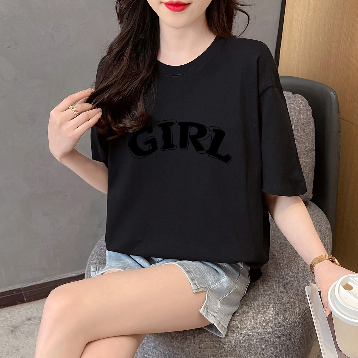 米子旗夏季圆领字母印花女式大码T恤宽松休闲慵懒风短袖上衣 516506