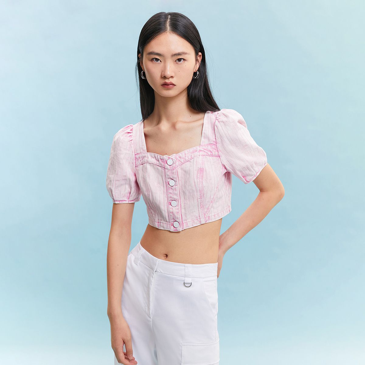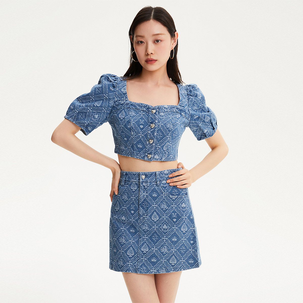 【甜酷辣妹】专柜款短款钻石领泡泡袖印花牛仔上衣女 754769