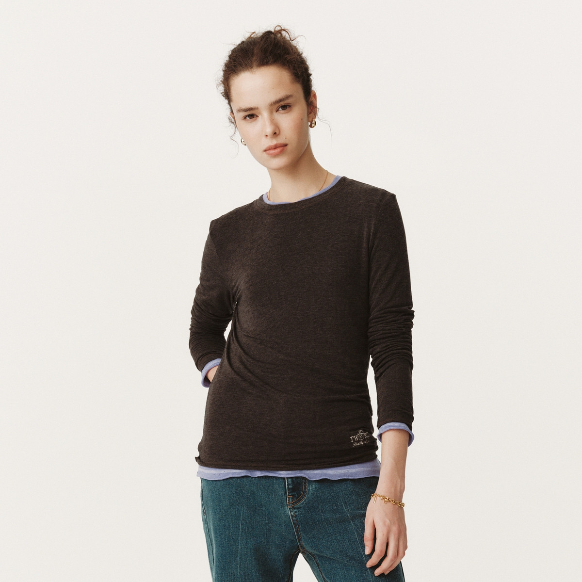 米子旗春秋款圆领女式T恤纯色宽松下摆开叉设计长袖上衣 544474