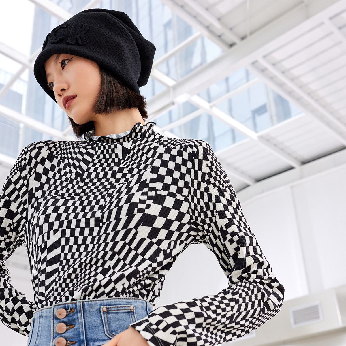【弹力T恤】春夏格纹半高领木耳边舒适打底上衣女气质百搭时尚 288785