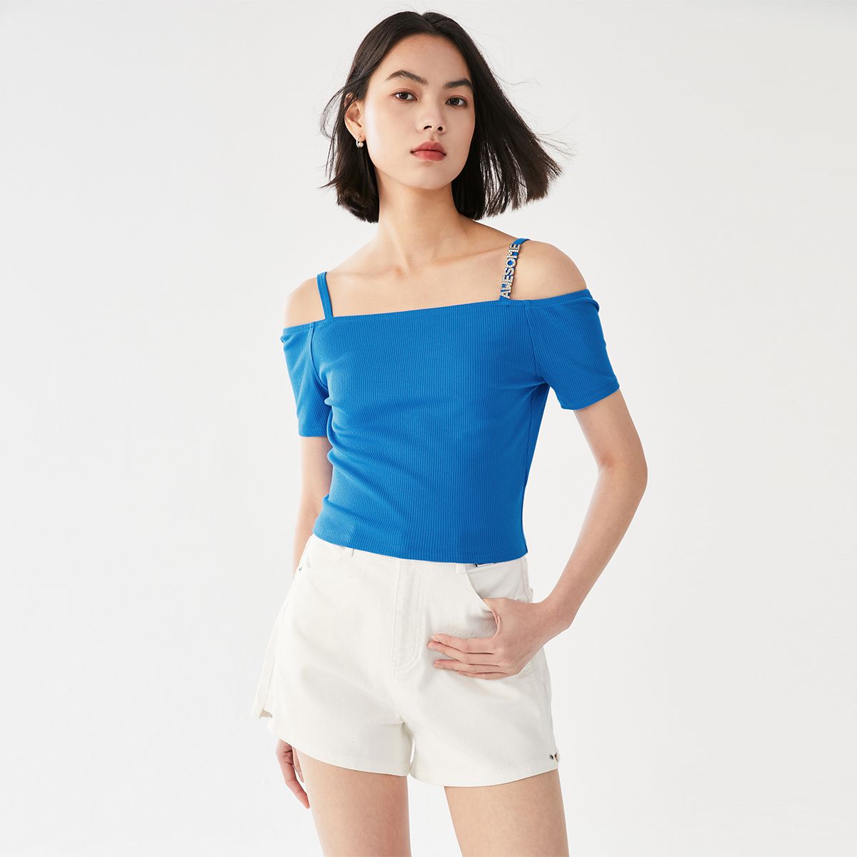 【水钻字母立体装饰】春夏专柜款夏吊带一字肩T恤上衣女百搭时尚 180561