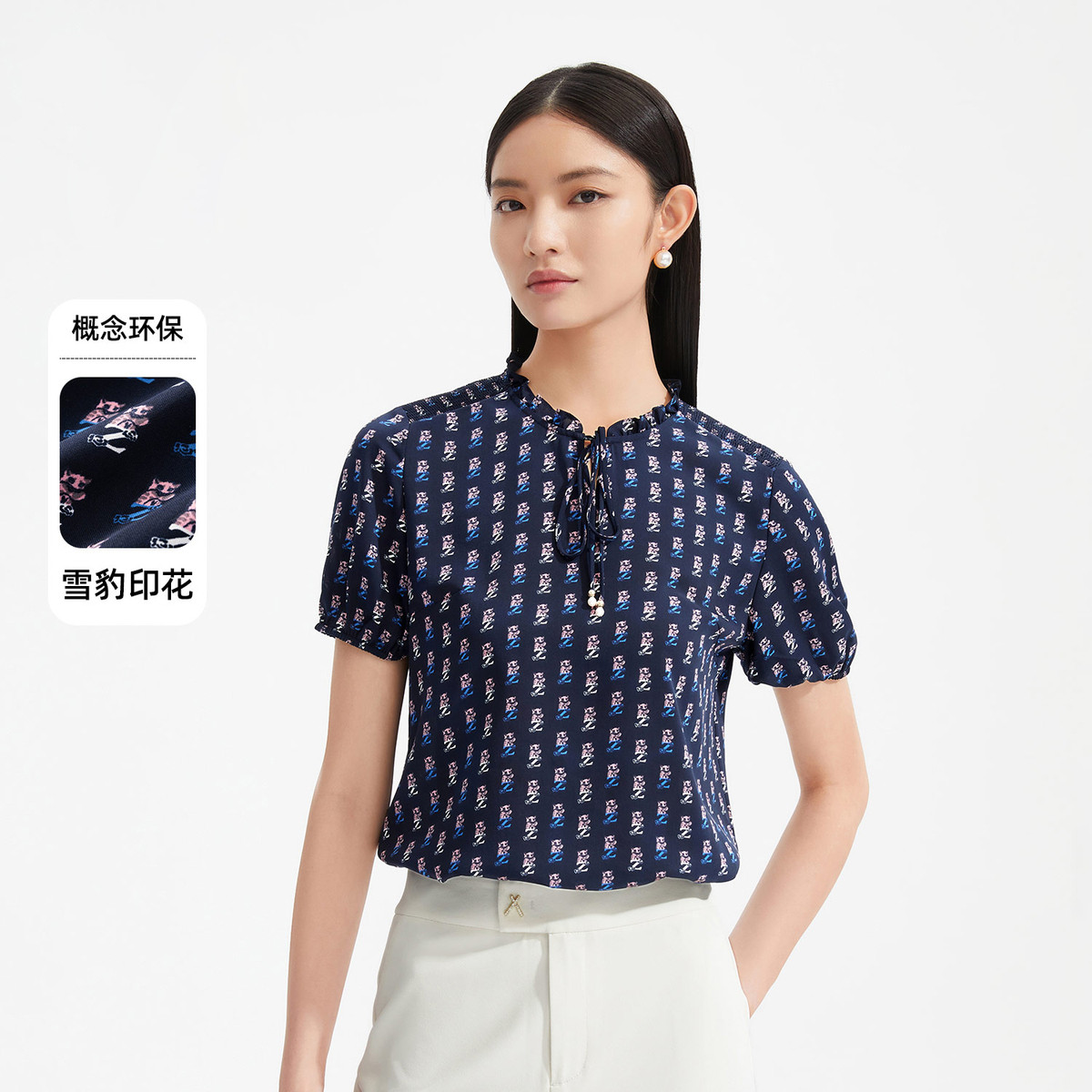 JZ玖姿夏季雪豹印花花边系带领雪纺短袖T恤女 102348