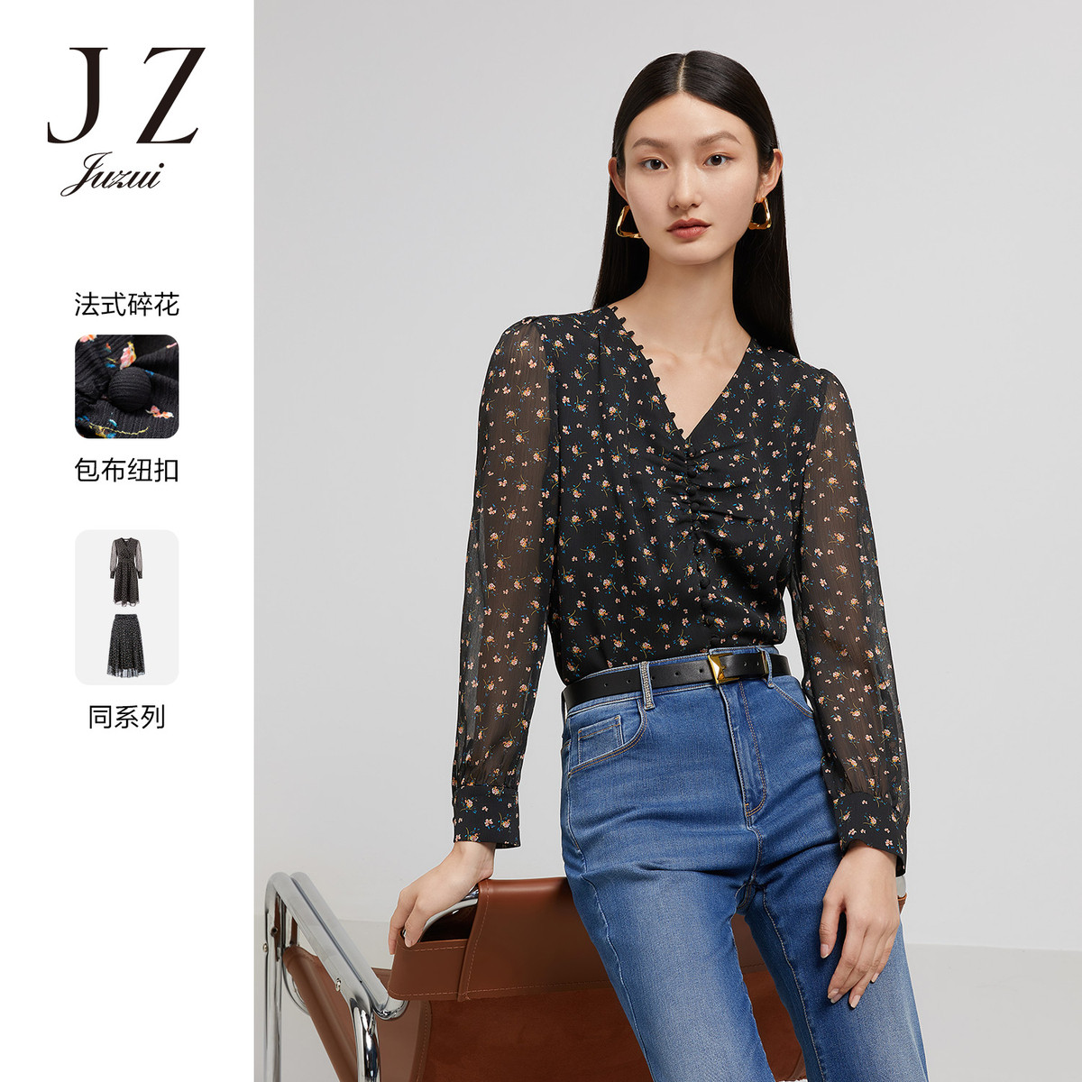 玖姿春季法式浪漫碎花V字领雪纺褶皱单上衣女 769100