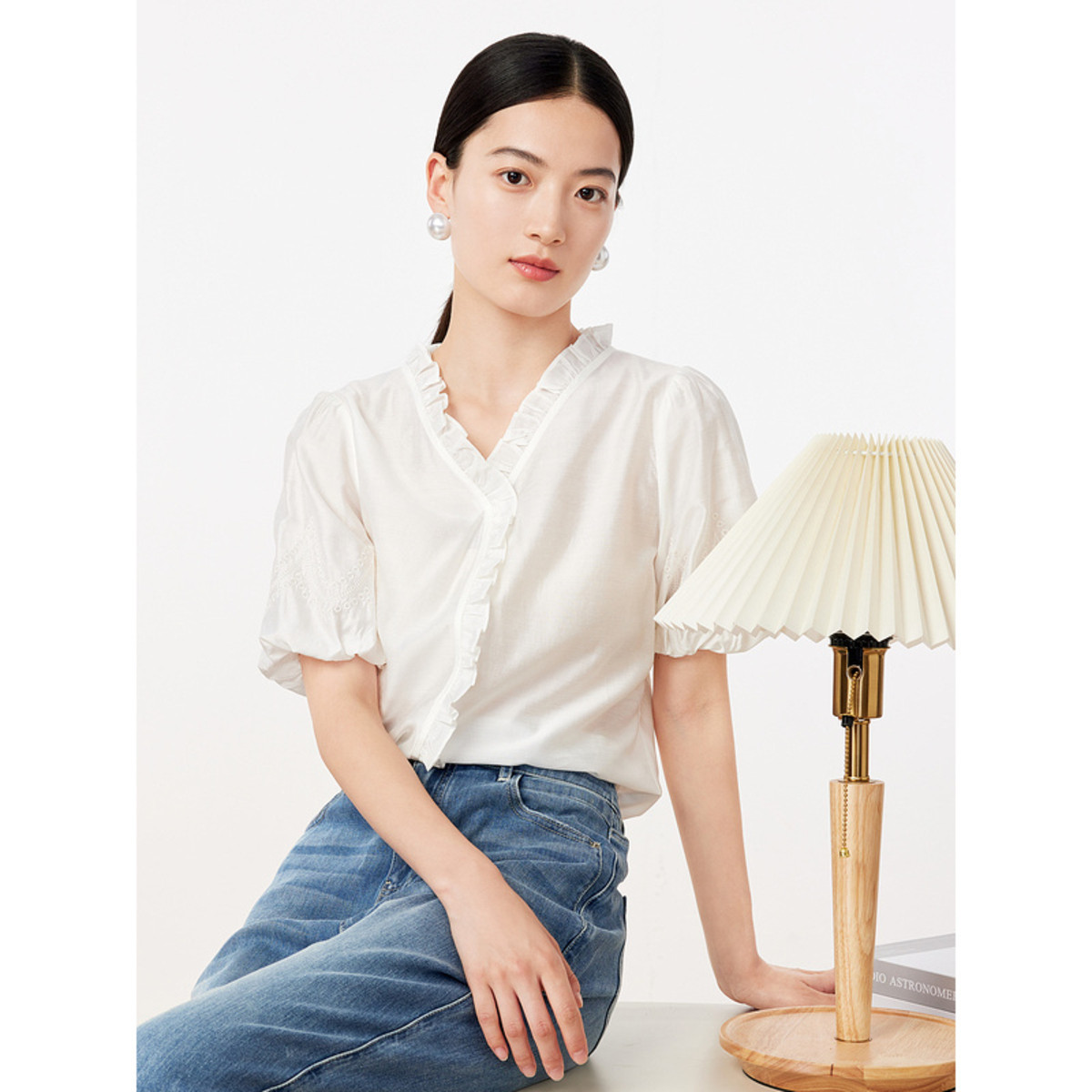 JZ玖姿夏季复古宫廷风木耳边泡泡袖女式T恤 108876