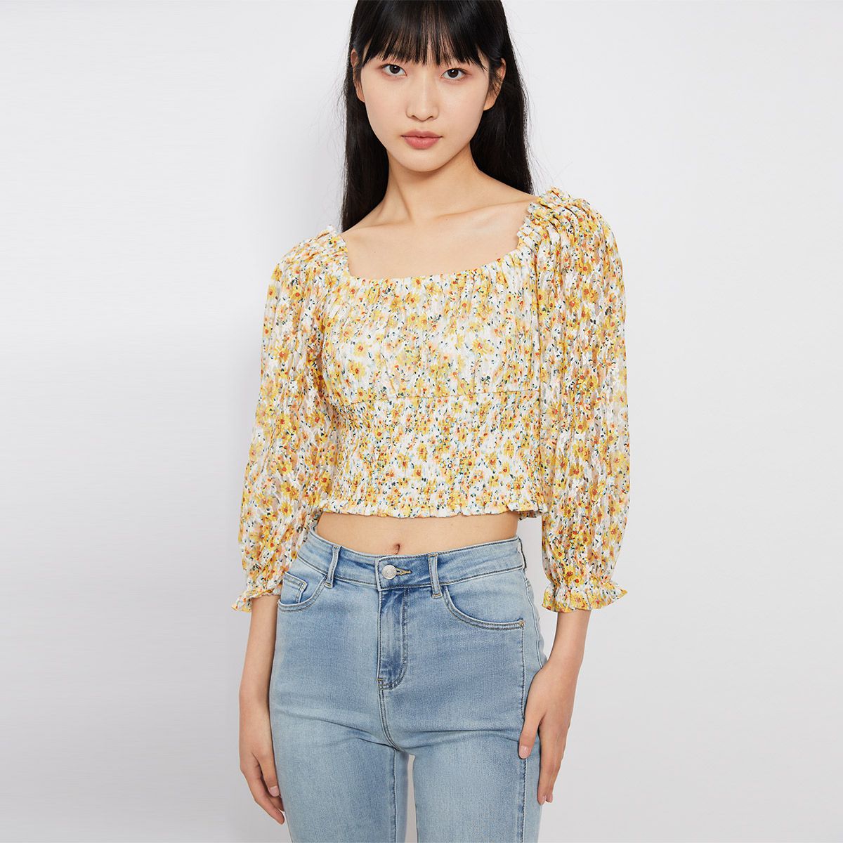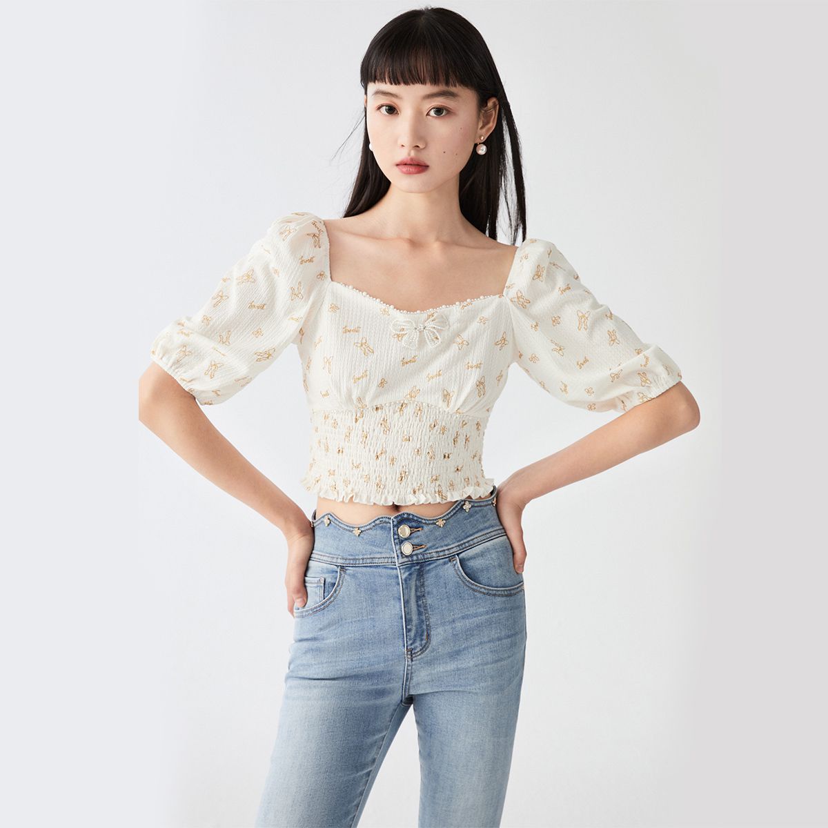 【方领泡泡袖】春夏减龄蝴蝶结印花收腰设计优雅短款T恤上衣女 434513