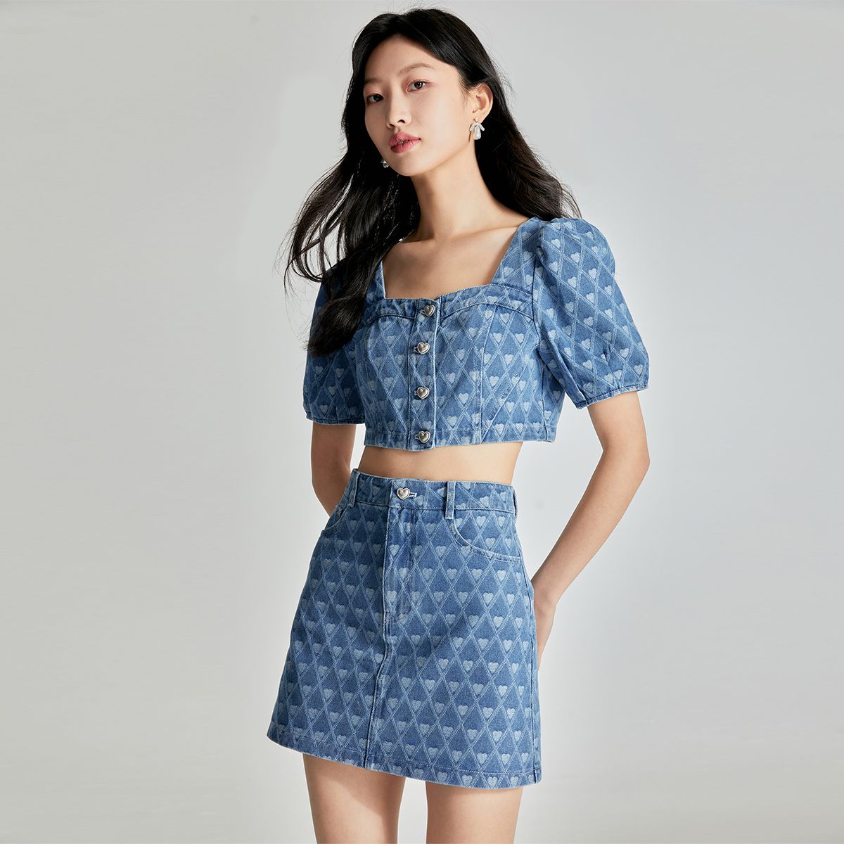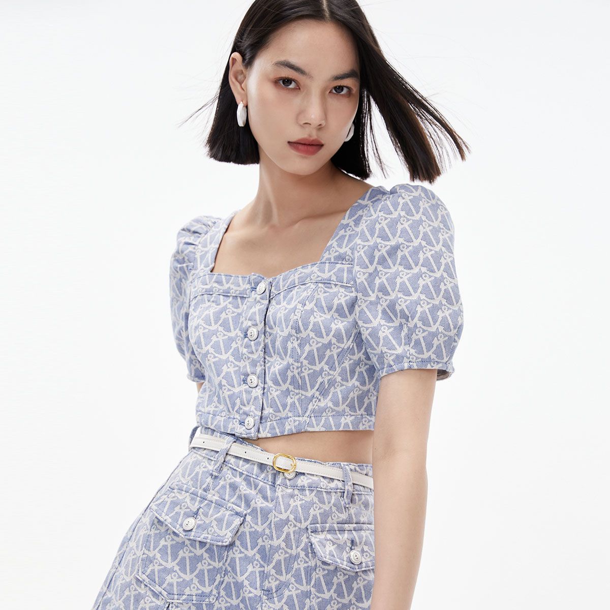 【牛仔上衣】专柜款夏休闲百搭短款方领泡泡袖T恤女 890193