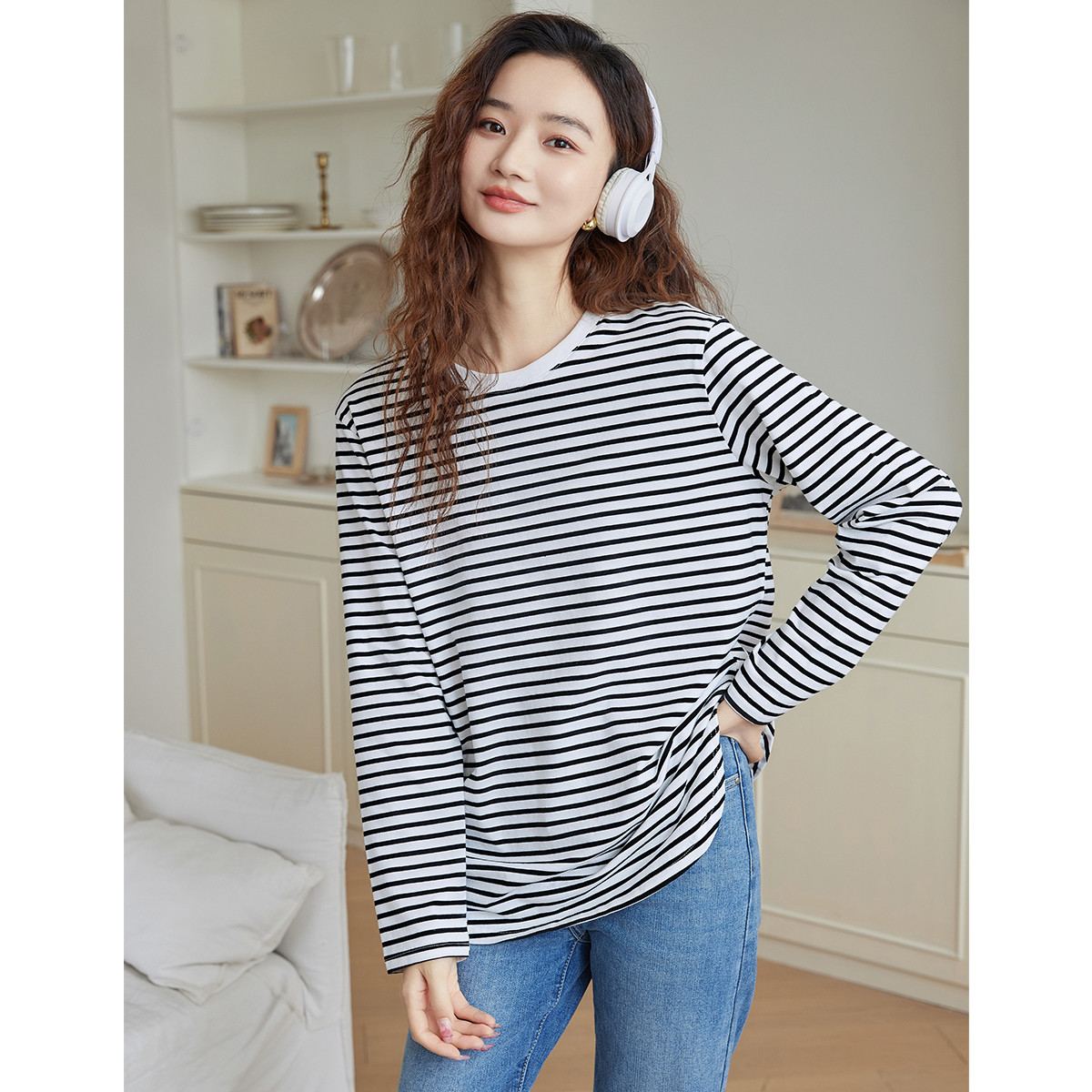 米子旗春秋款圆领条纹T恤女宽松休闲开叉侧边长袖上衣 688602