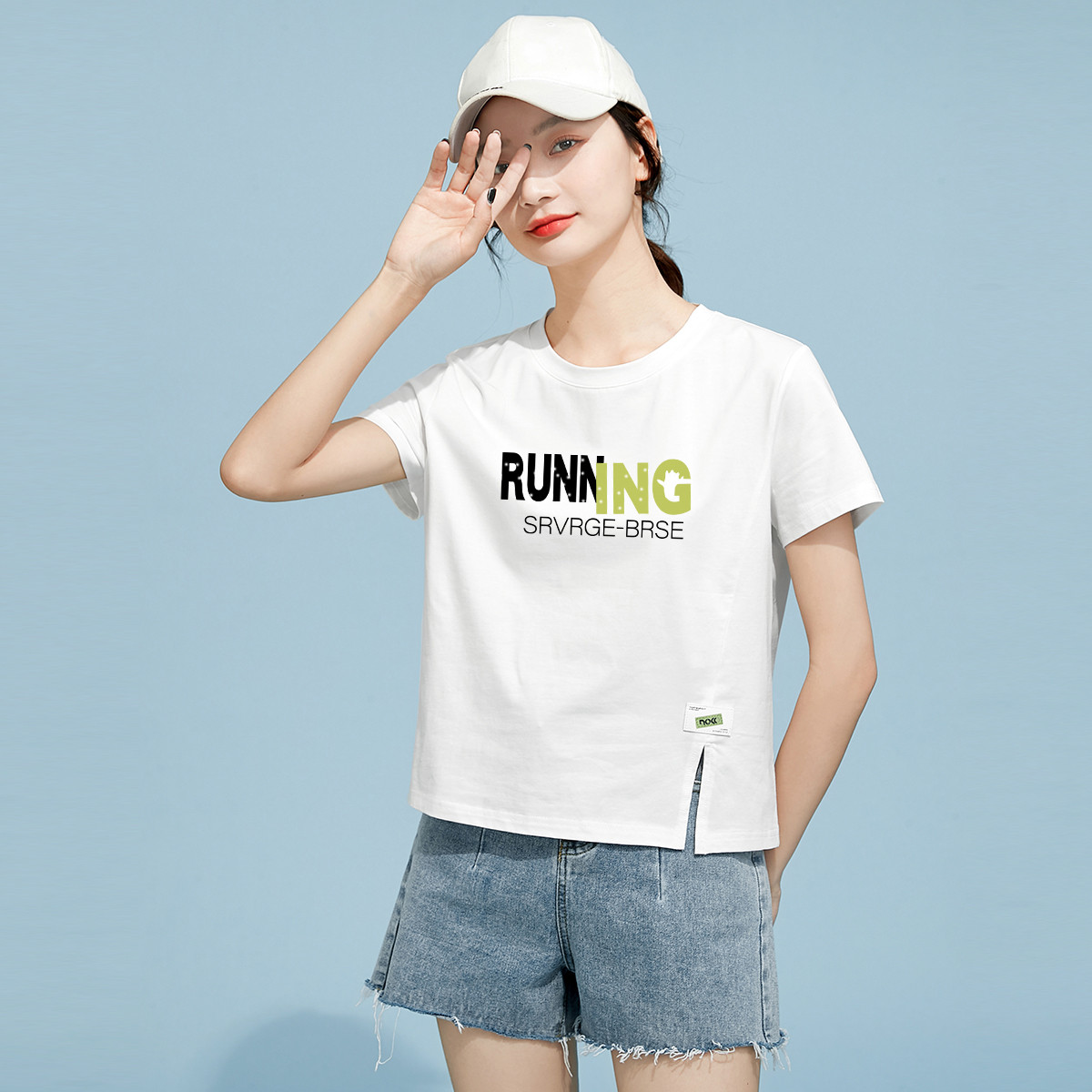 米子旗夏季款圆领女式T恤字母印花下摆开叉宽松短袖上衣 503130