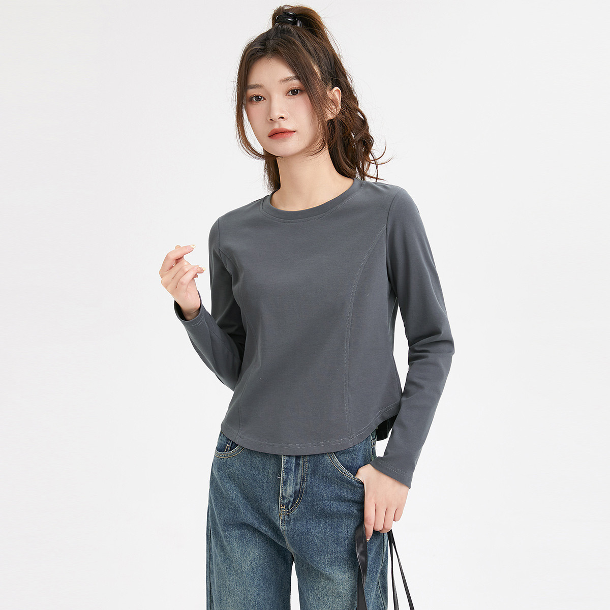 米子旗春秋季圆领女士T恤简约百搭休闲长袖打底衫女 008474