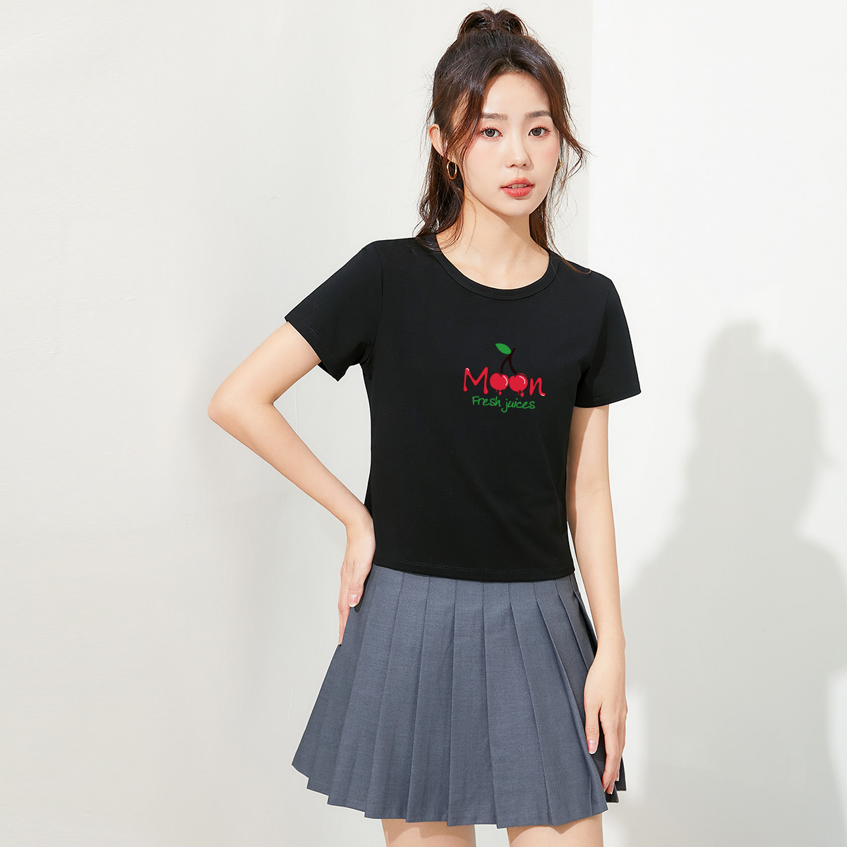 米子旗夏季款圆领女式T恤樱桃印花修身短款短袖上衣女 191962