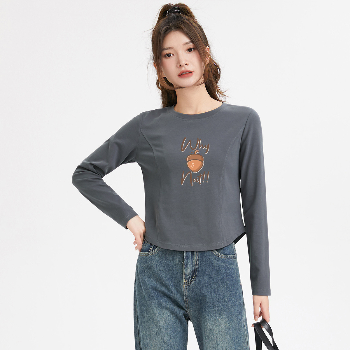 米子旗春秋款圆领女式T恤印花长袖上衣百搭基础款 956762