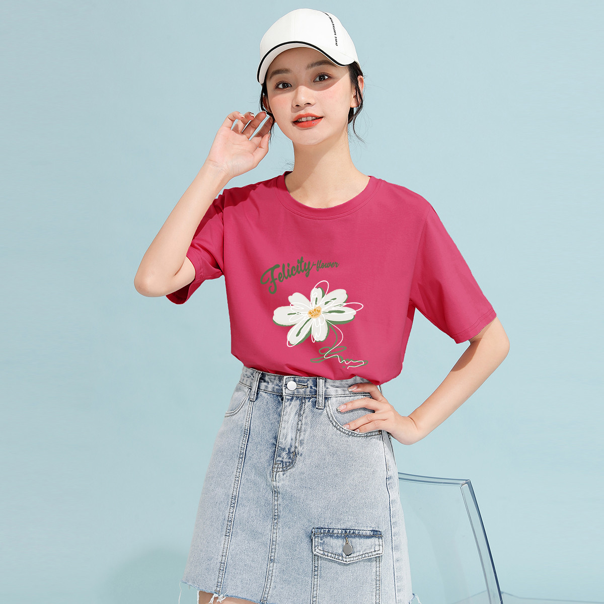 【玫瑰印花】夏季圆领短袖宽松t恤女棉氨针织女式t恤 918401