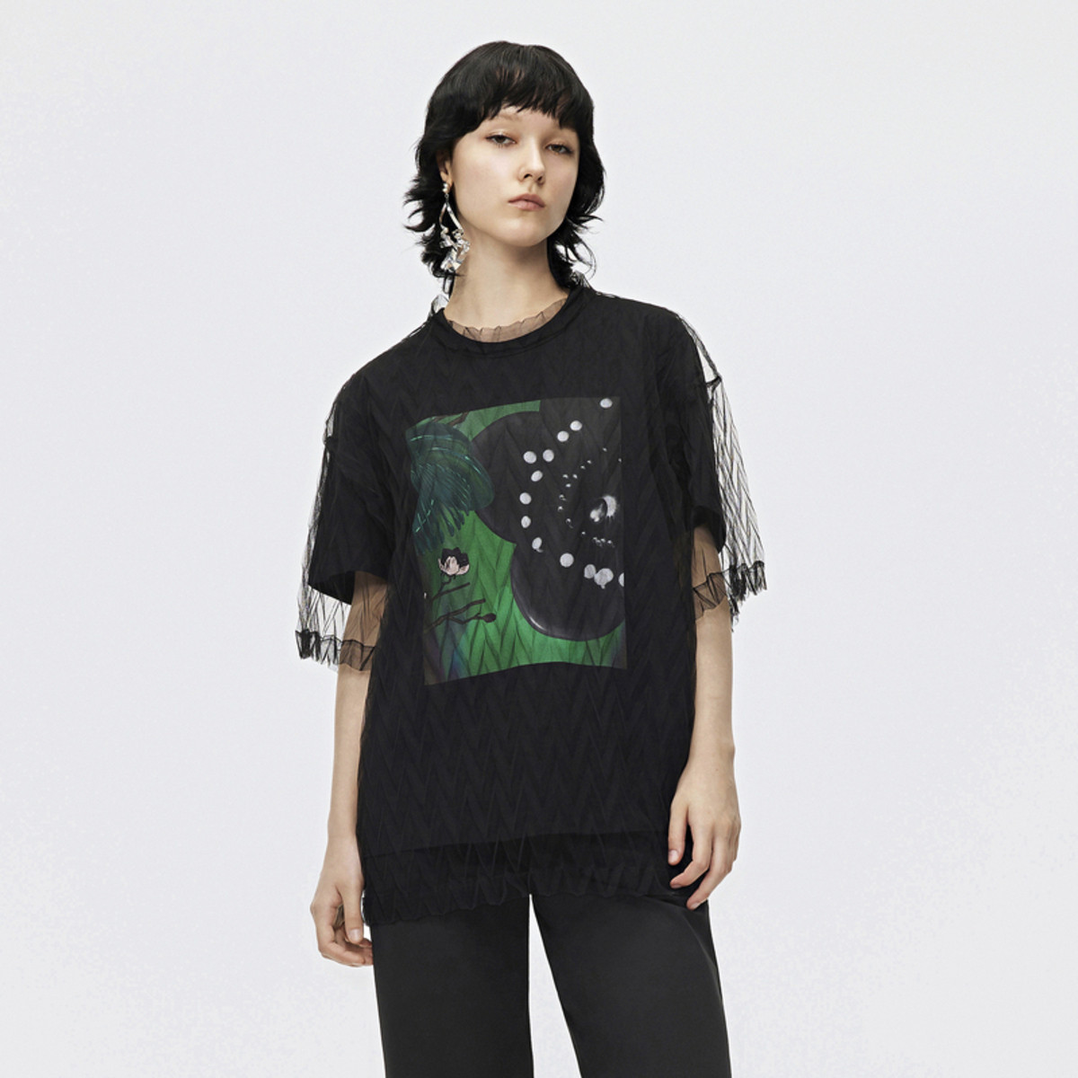 网纱印花蝴蝶个性设计撞色女式T恤夏季修身短款圆领上衣 294685