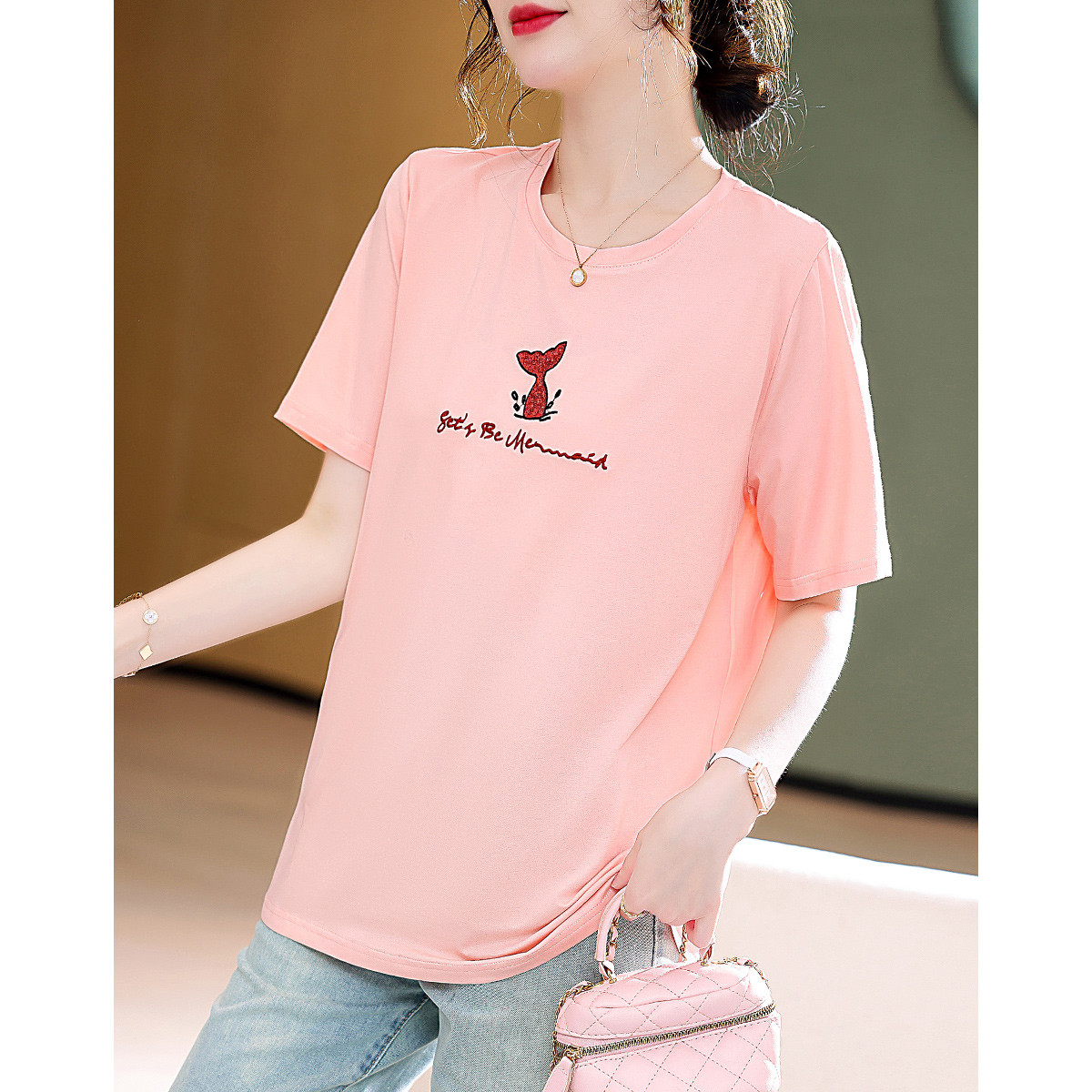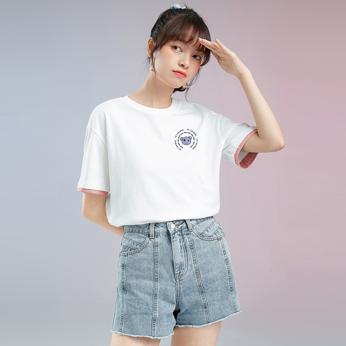 米子旗夏季款圆领女式T恤卡通印花套头纯色宽松短袖上衣 330074