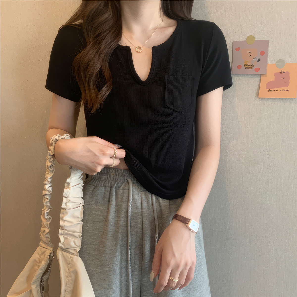 冰丝V领甜美小个子百搭显瘦修身时尚短袖t恤女 924483