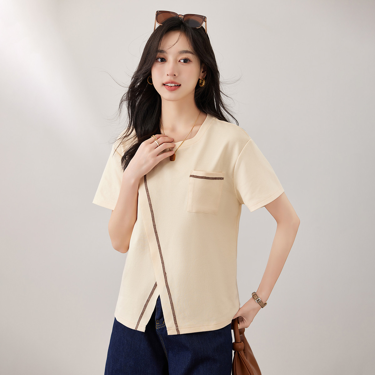 t恤女短袖夏季不规则开叉下摆时尚舒适圆领上衣 535448