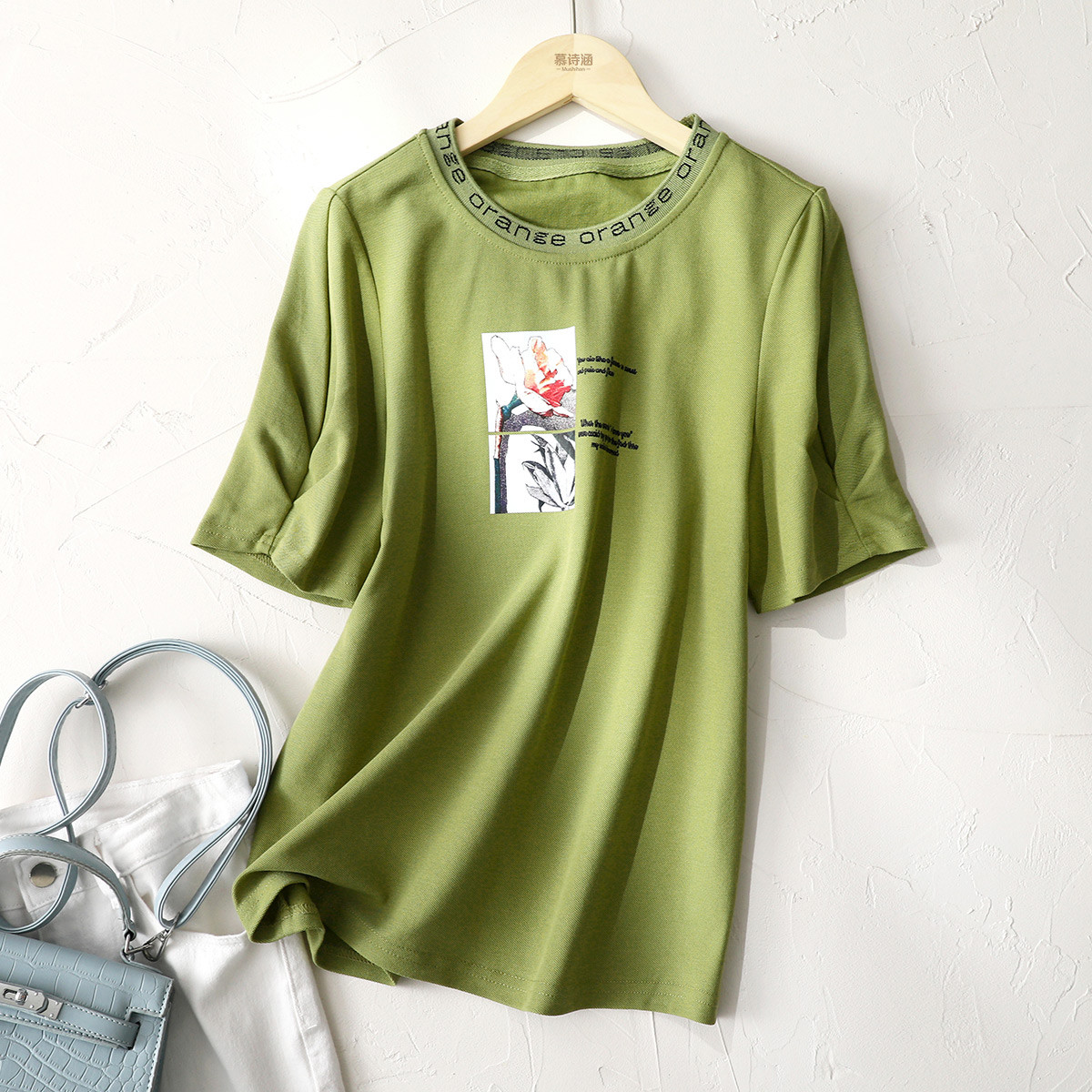 米子旗夏季圆领字母印花女式大码T恤宽松休闲慵懒风短袖上衣 516506
