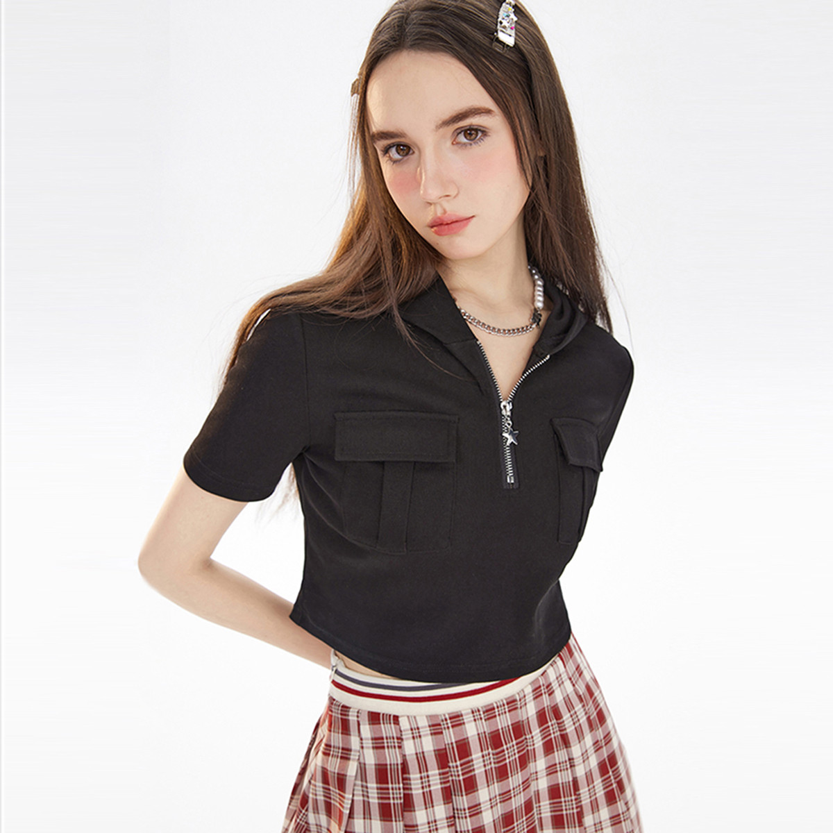 夏装奶系炸街短袖t恤女修身拉链连帽辣妹上衣 735956