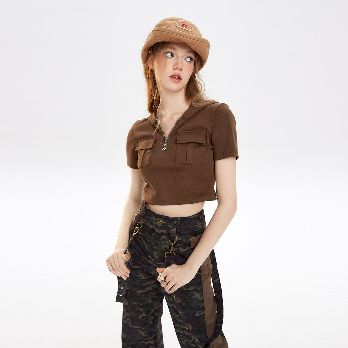 夏装奶系炸街短袖t恤女修身拉链连帽辣妹上衣 748244