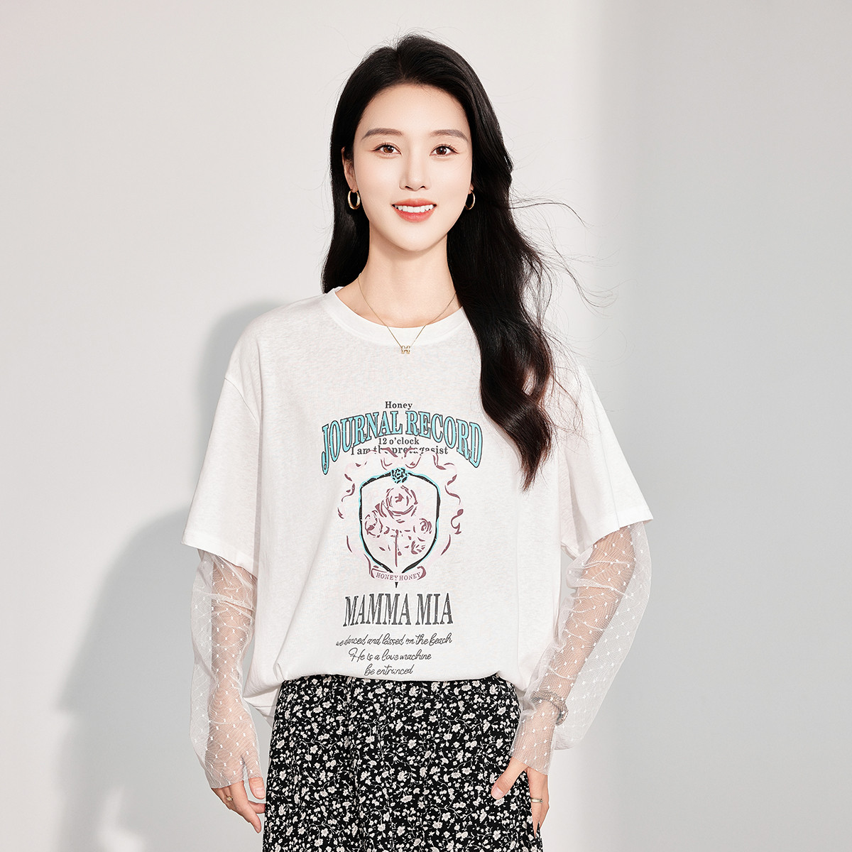 【韩系休闲】25夏季新款街头慵懒风拼接蕾丝女时尚T恤上衣 196255