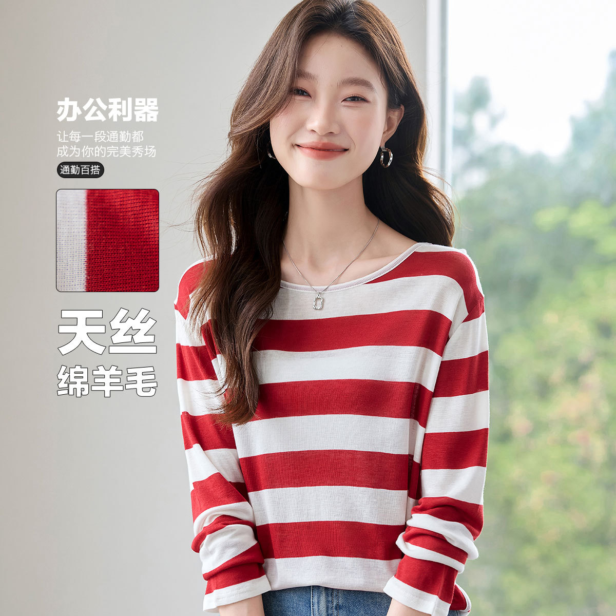 【含绵羊毛莱赛尔】夏季经典条纹空调衫轻薄长袖圆领t恤上衣女 385759