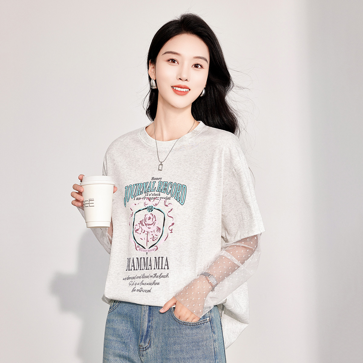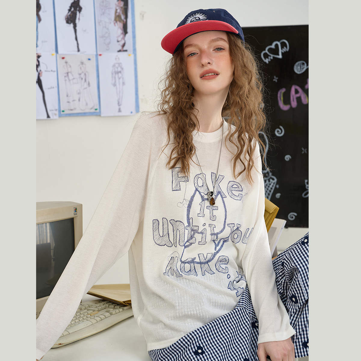 美式复古慵懒风透气长袖罩衫上衣2025夏季休闲百搭女式T恤 671965