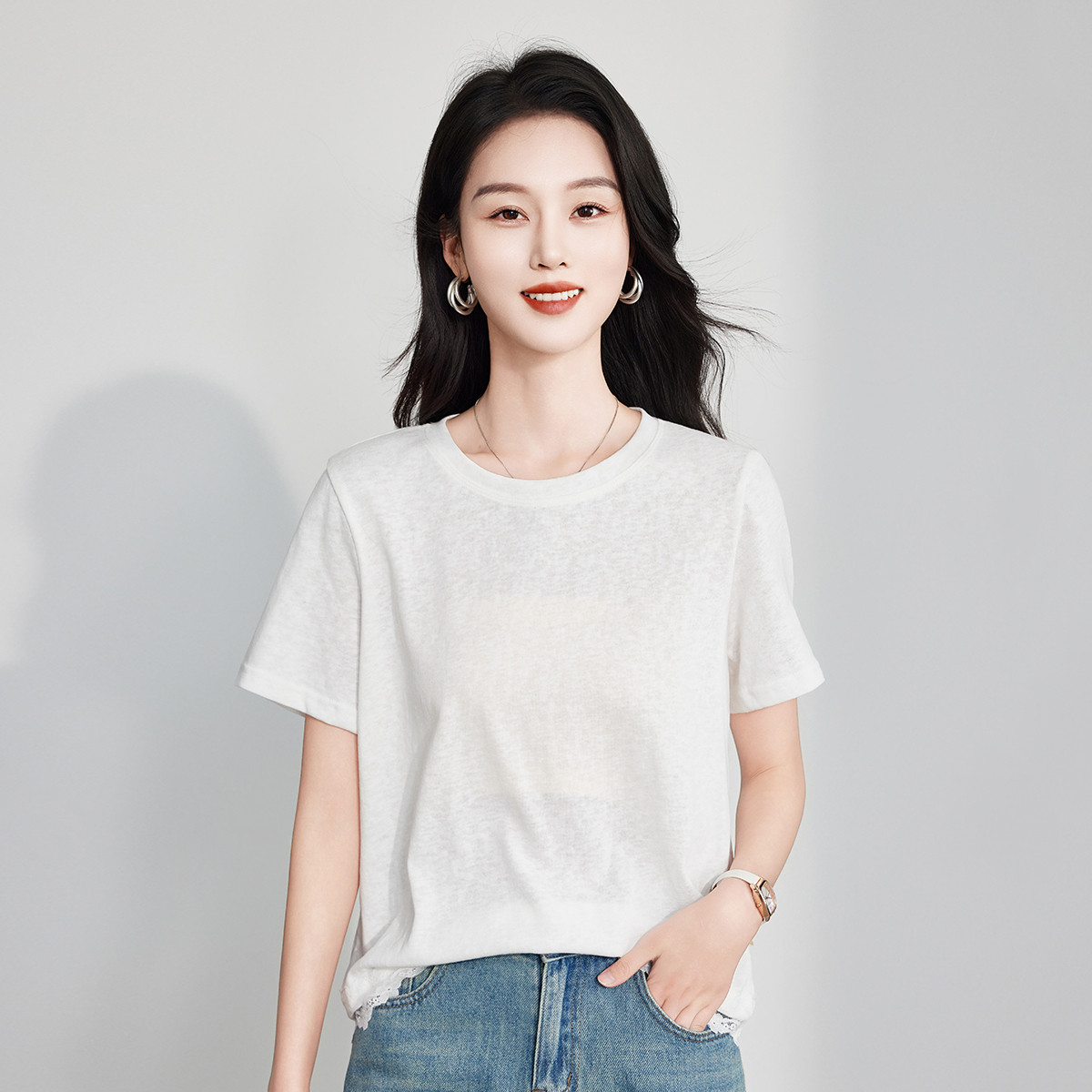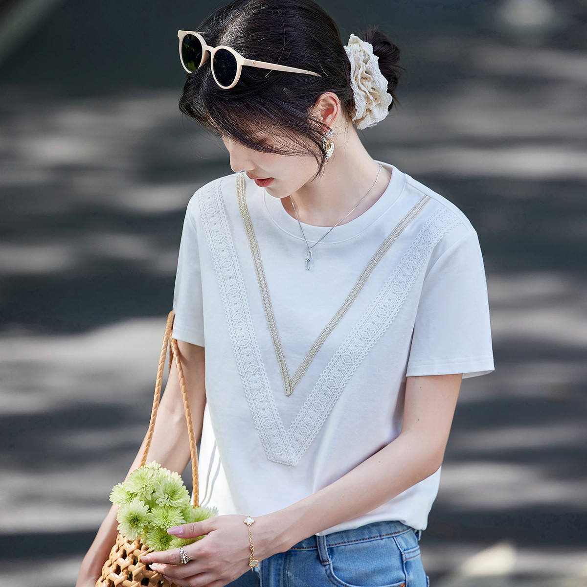 【极简风】25夏季小清新蕾丝拼接下摆短袖T恤女式日常百搭上衣 263007