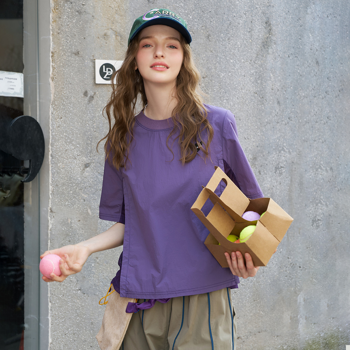 米子旗春秋款圆领女式T恤纯色宽松下摆开叉设计长袖上衣 544474