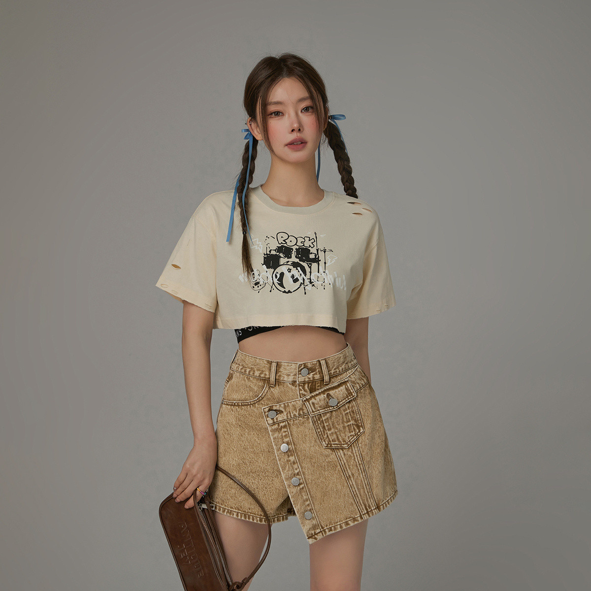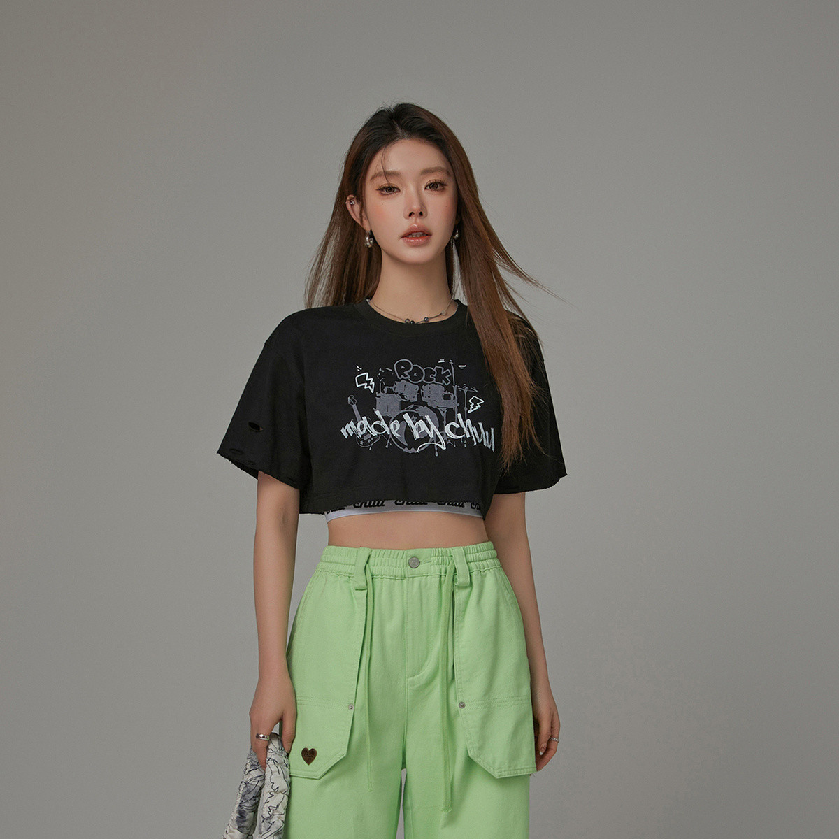 字母印花T恤女士2025夏辣妹镂空磨破圆领宽松短袖上衣 640019
