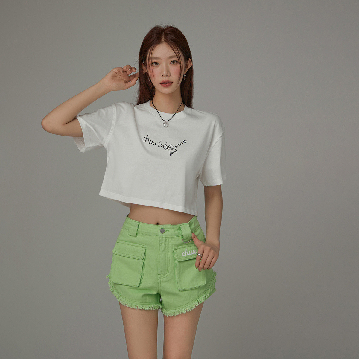 网纱印花蝴蝶个性设计撞色女式T恤夏季修身短款圆领上衣 294685