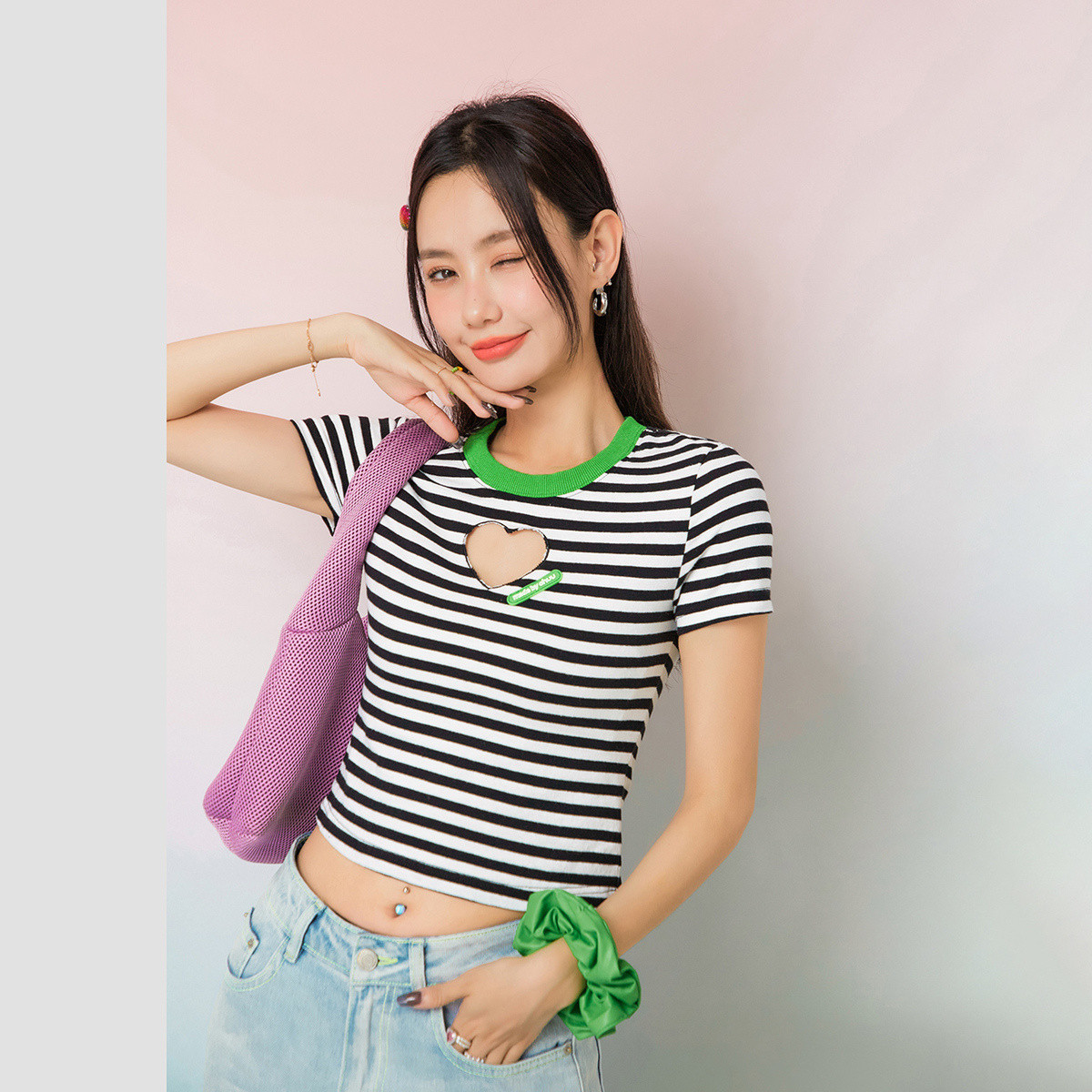 条纹镂空爱心短袖T恤女夏小众别致短款上衣 871059