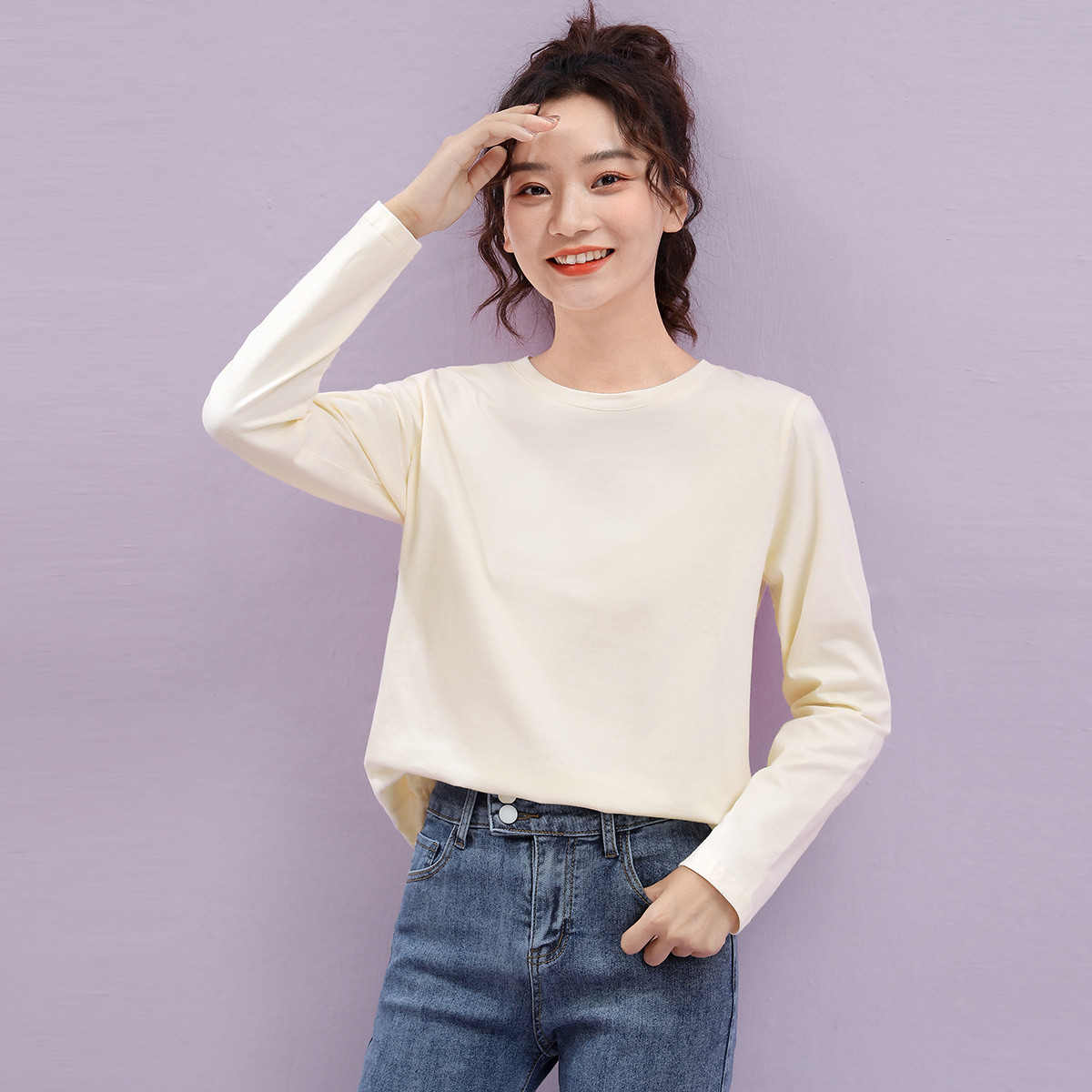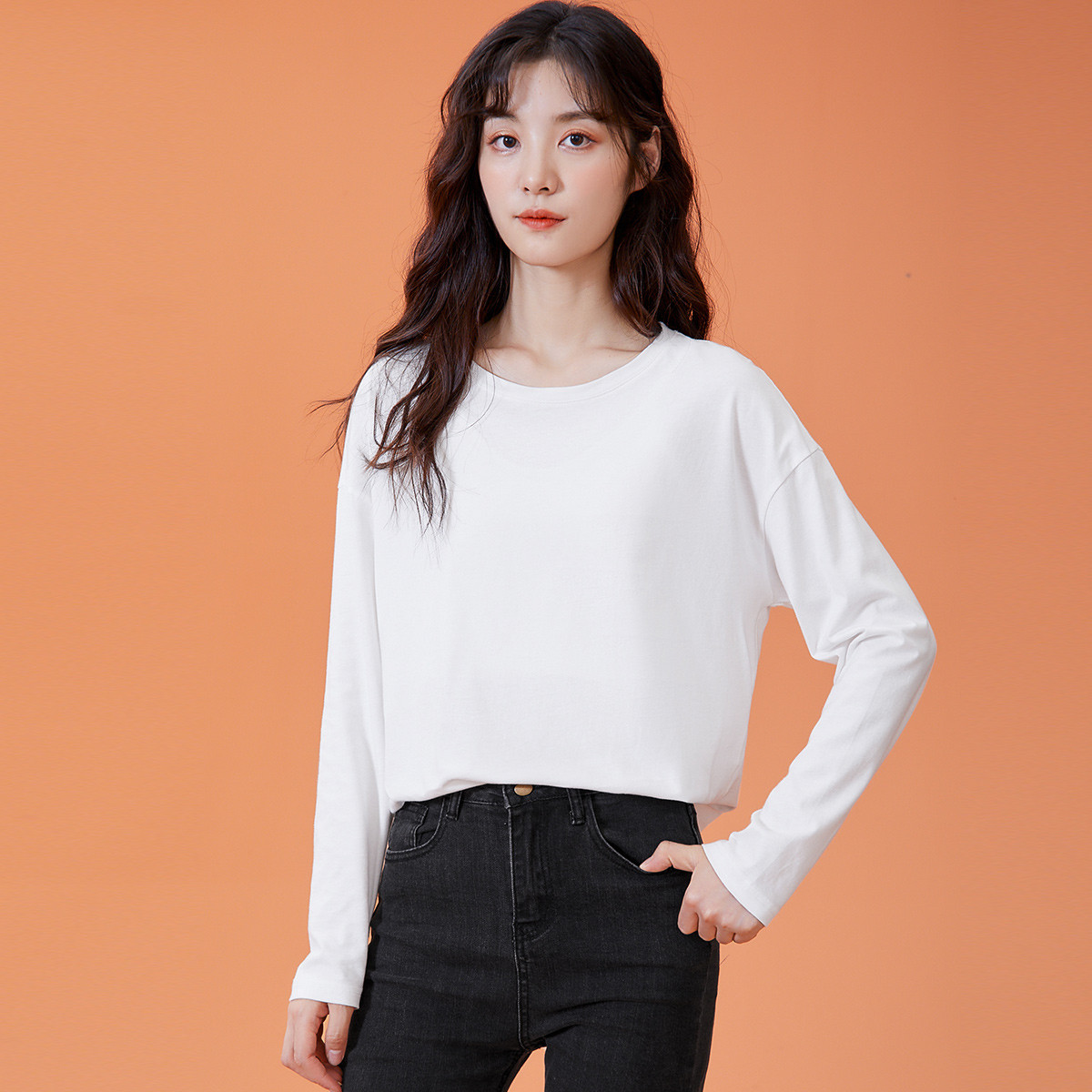 米子旗春秋季款女式长袖上衣百搭纯色高级感女款圆领T恤 172314