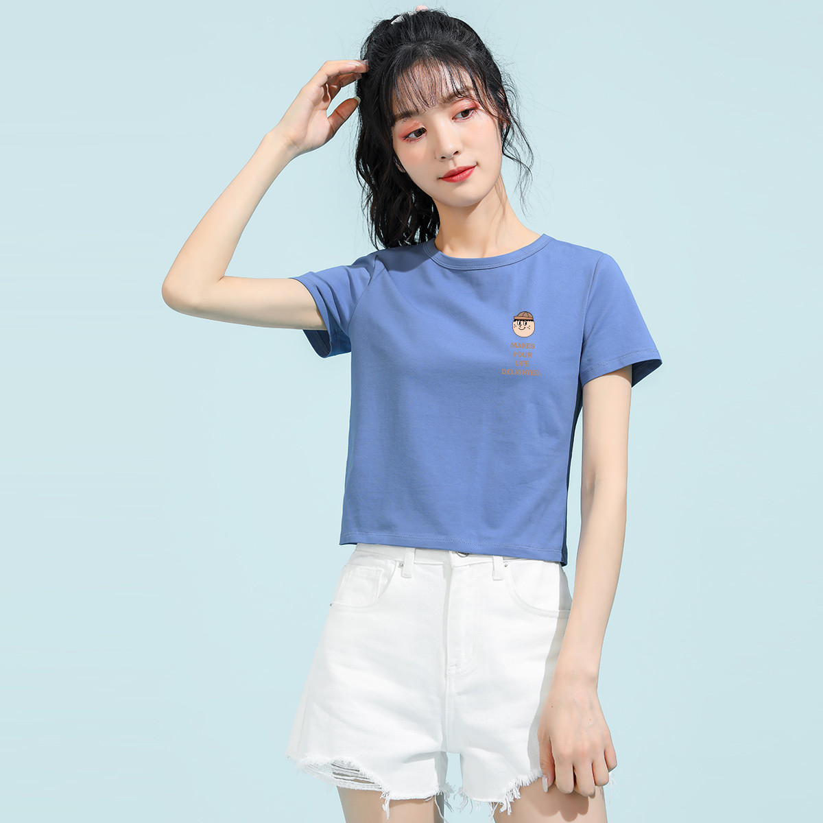 米子旗初夏韩版时尚百搭圆领T恤短款女上衣舒适透气 860122