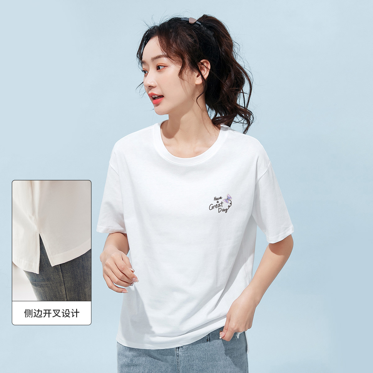 米子旗初夏短袖蝴蝶印花短袖韩版休闲下摆开叉圆领大码T恤女 958042