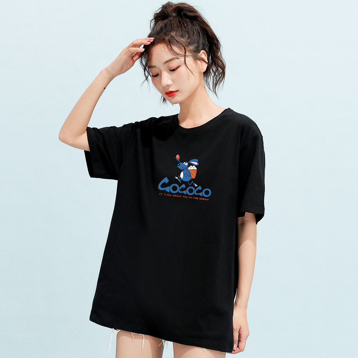 米子旗夏季圆领字母印花女式大码T恤宽松休闲慵懒风短袖上衣 516506