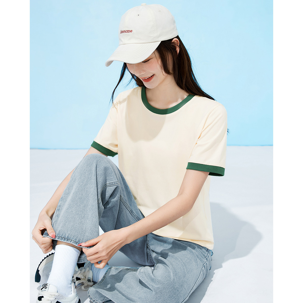 米子旗夏季款圆领撞色T恤女宽松显瘦纯色短袖上衣 873114