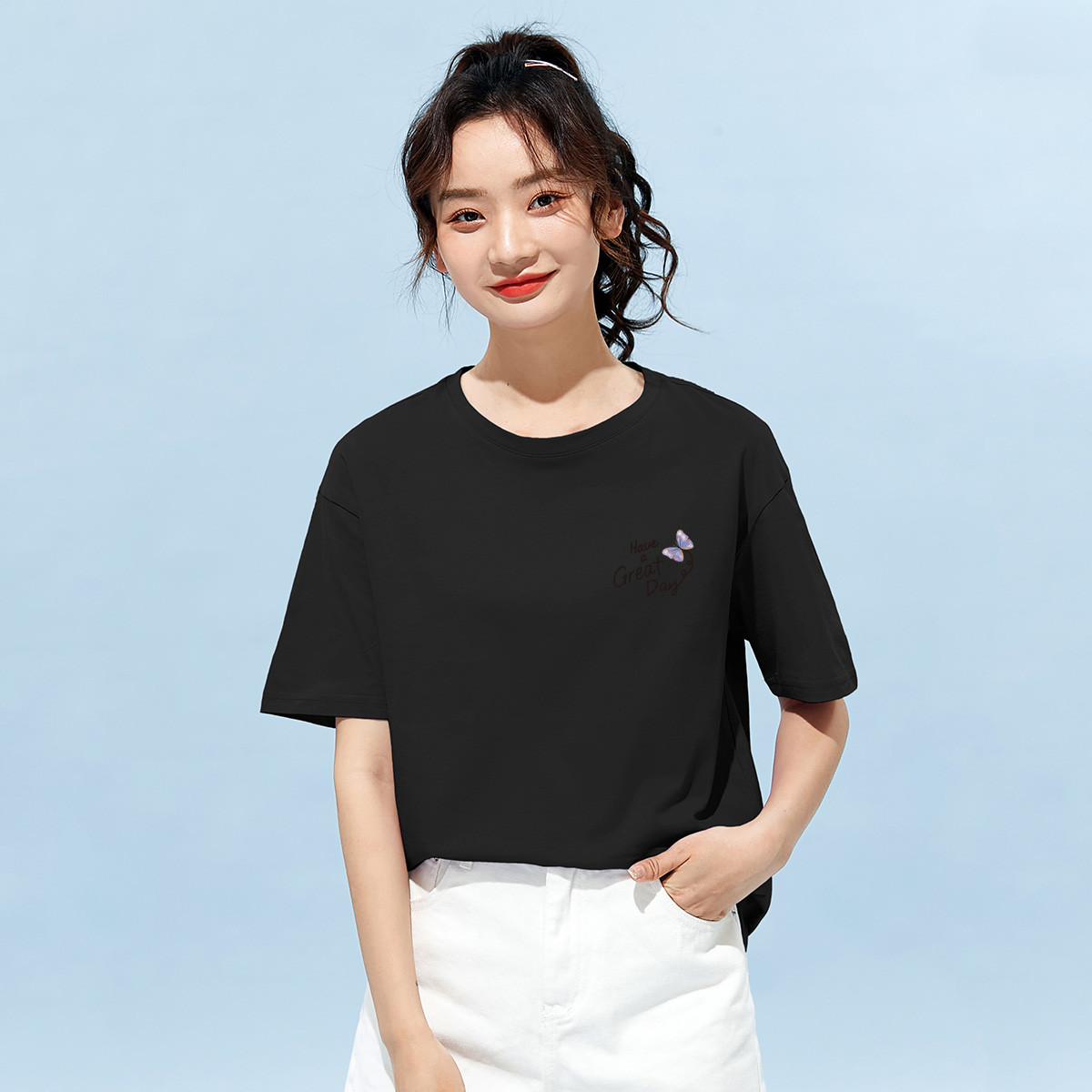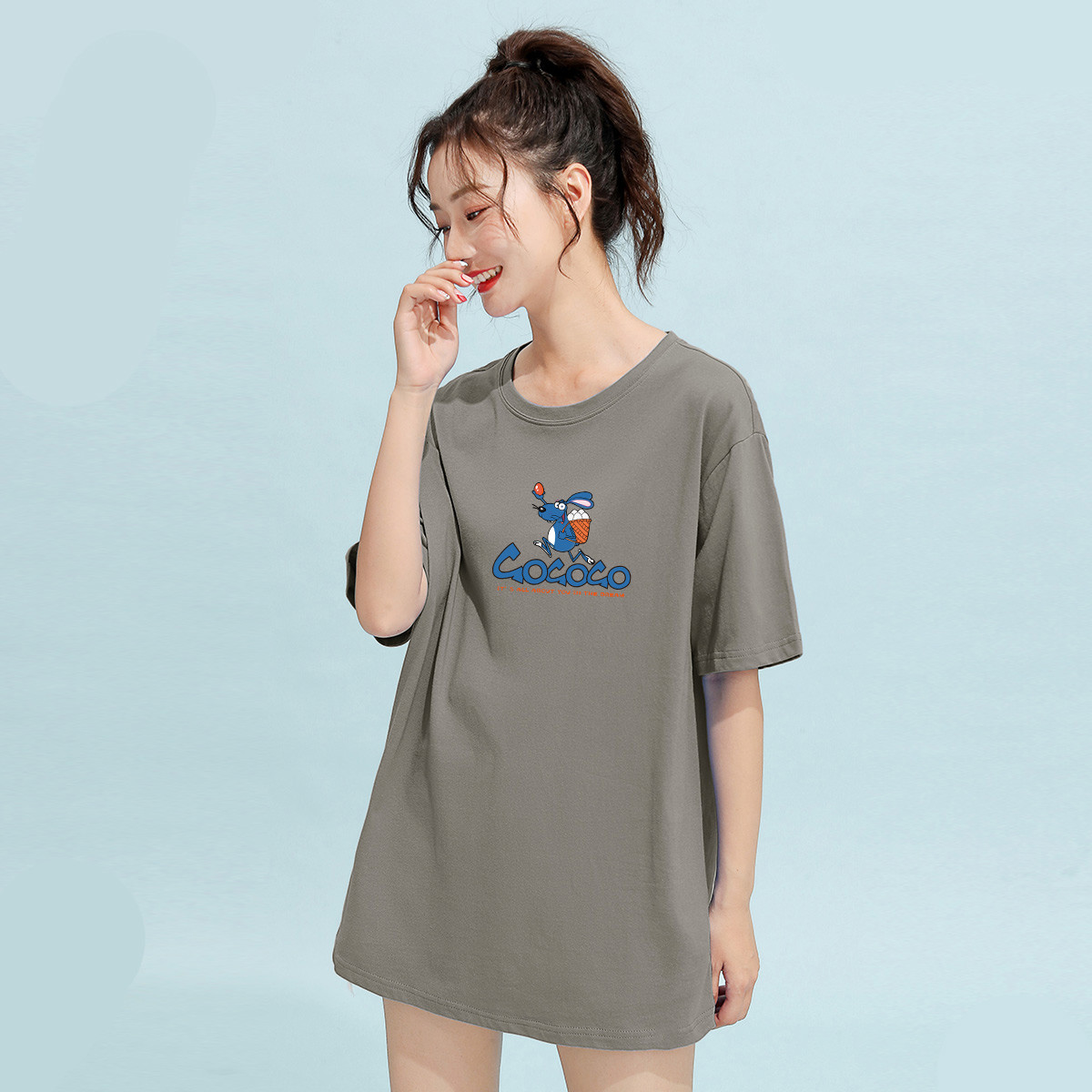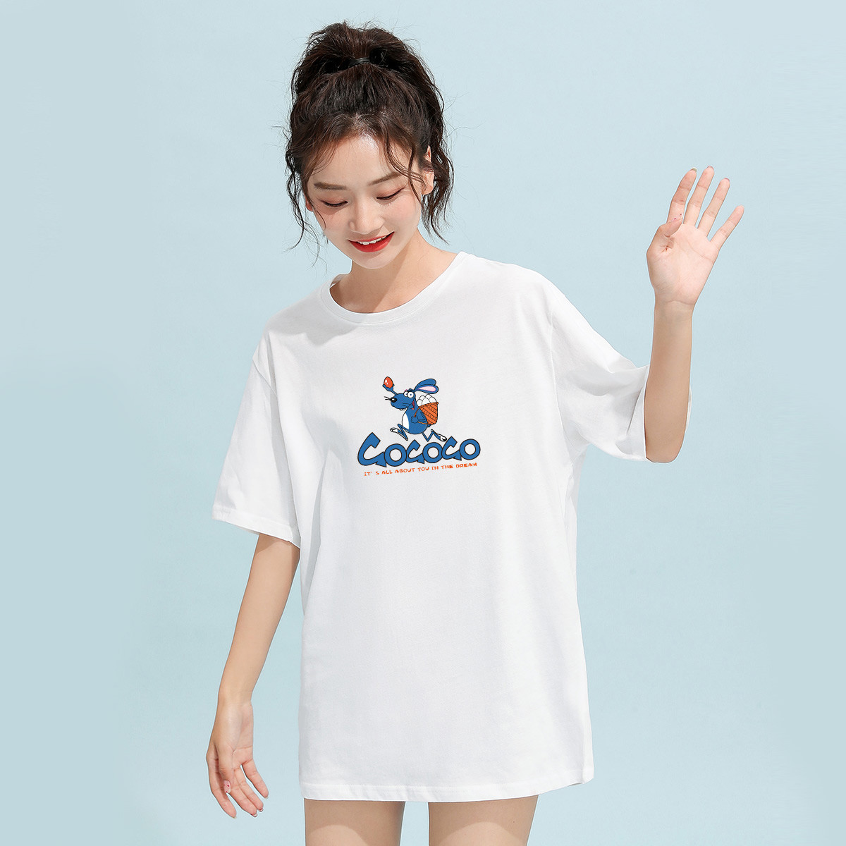 米子旗夏季款圆领女式T恤卡通印花套头纯色宽松短袖上衣 464282