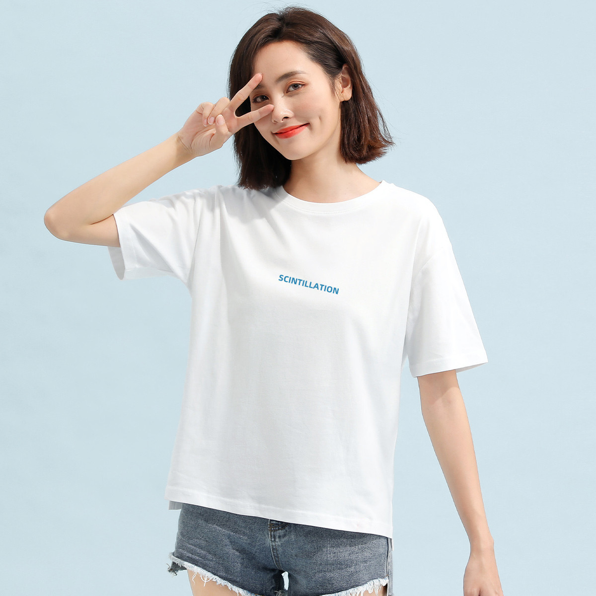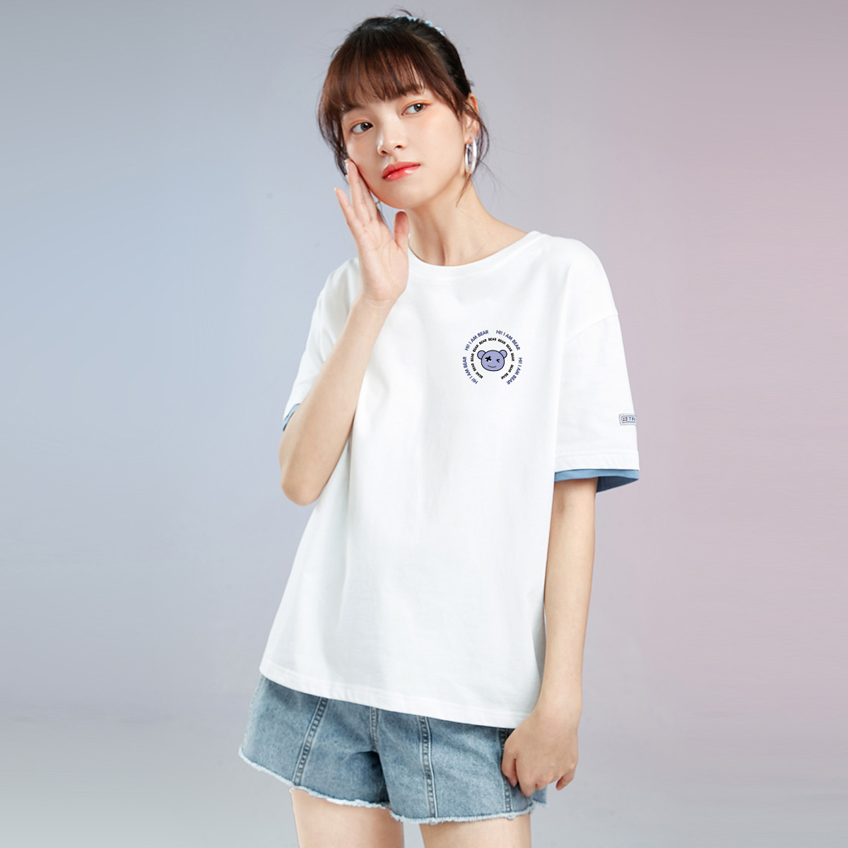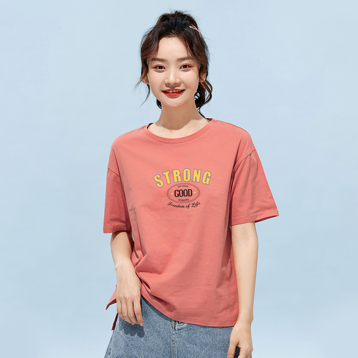 米子旗夏季款圆领女式T恤卡通印花套头纯色宽松短袖上衣 464282