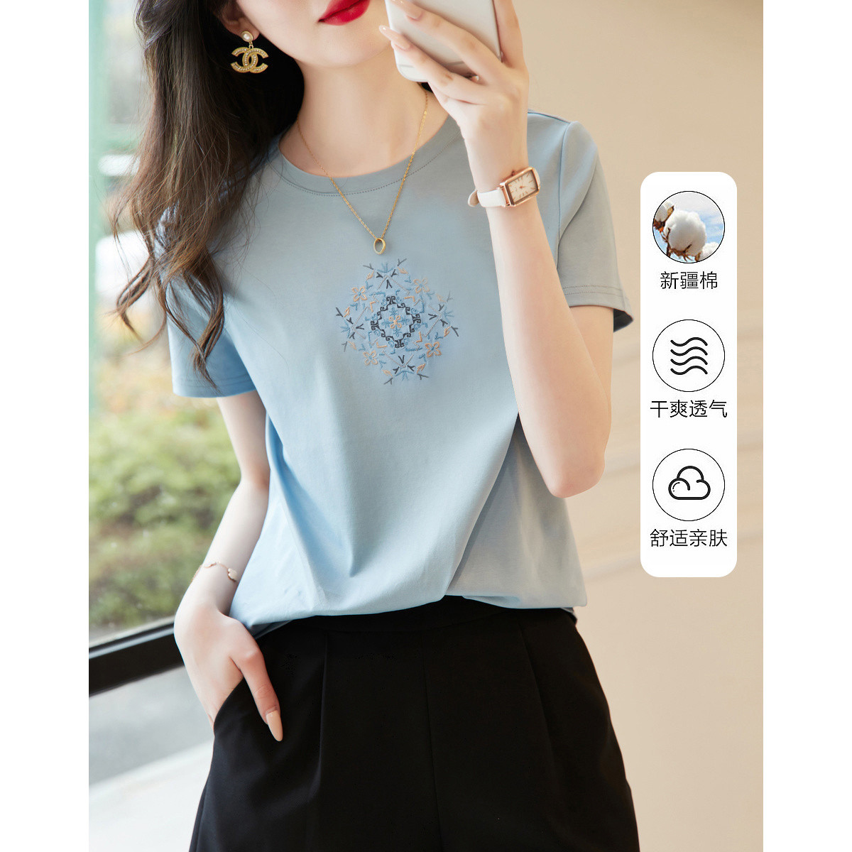 【绣花棉质女式t恤】春秋款圆领微弹几何对称短袖t恤女 290753