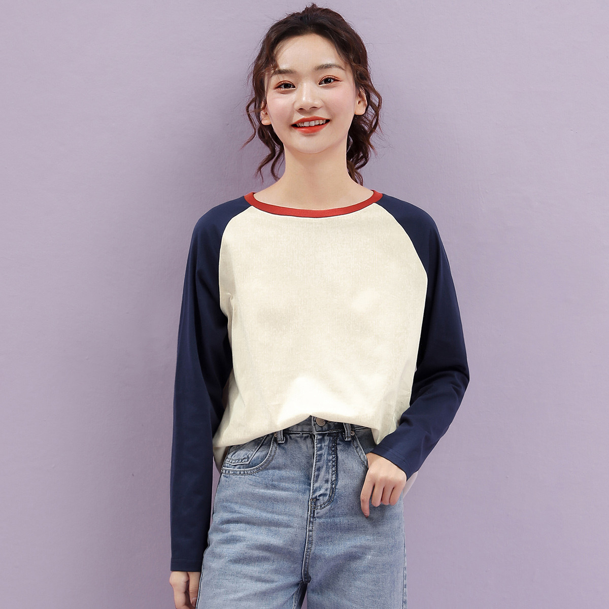 米子旗年春秋圆领女式T恤拼色套头长袖上衣基础款简约 191130