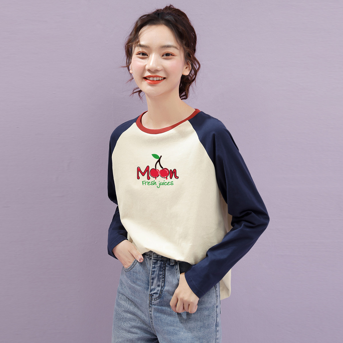 米子旗春秋款圆领女式T恤樱桃印花长袖上衣撞色简约百搭 107674