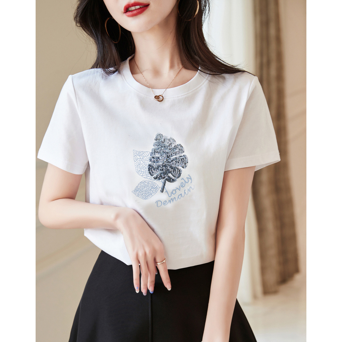 【树叶亮片绣花女式t恤】夏季棉氨针织圆领短袖t恤女 968577