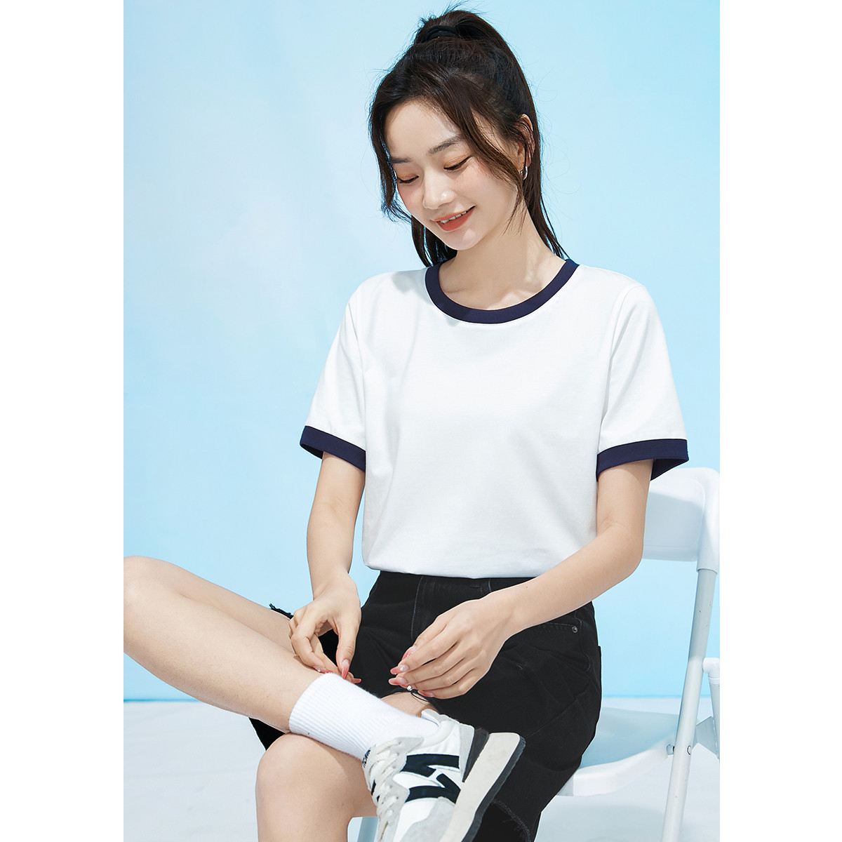 米子旗夏季款圆领撞色T恤女宽松显瘦纯色短袖上衣 930458