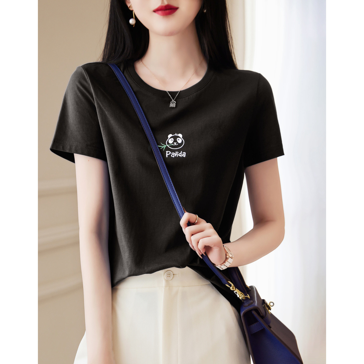 【熊猫刺绣棉质t恤】夏可爱圆领短袖t恤女字母女式t恤 262785