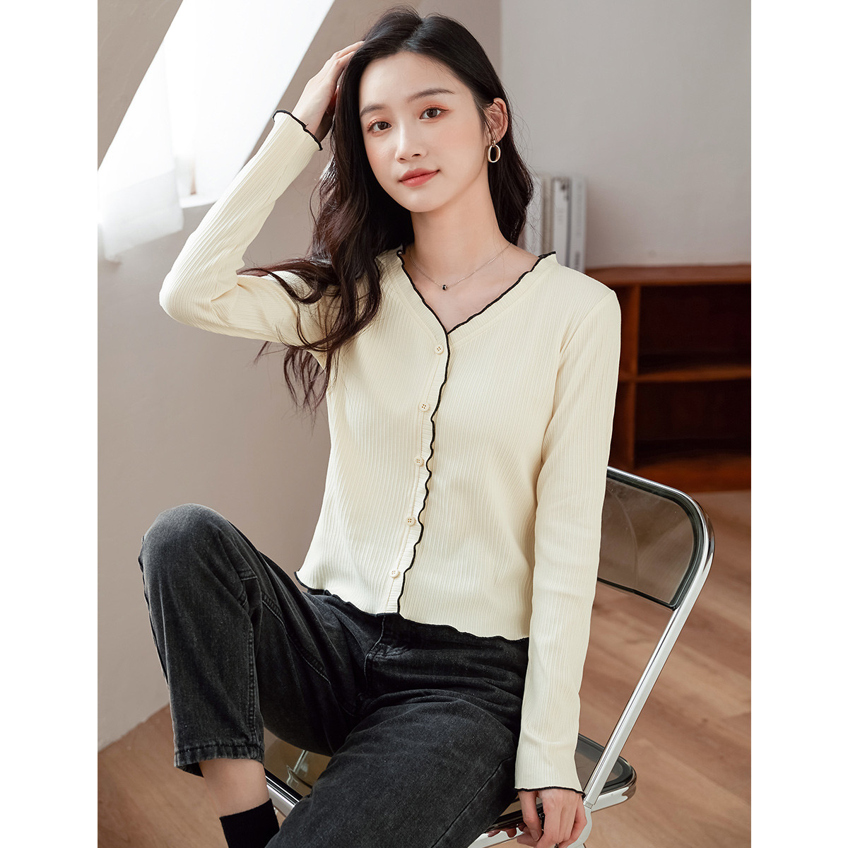 米子旗春秋款V领女式T恤修身纯色上衣简约百搭长袖打底衫 797082