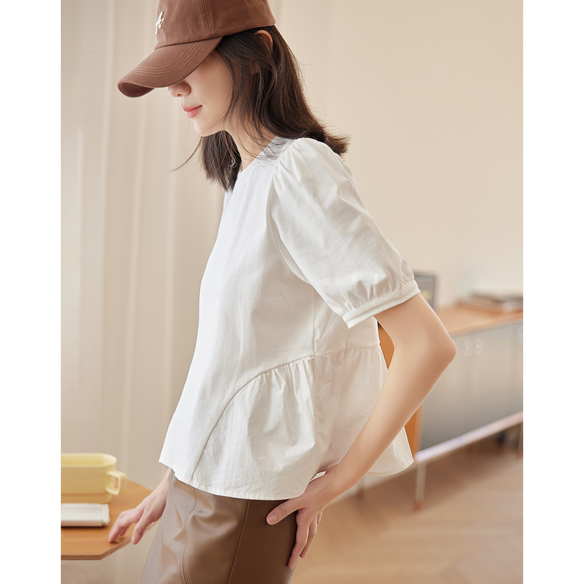 【甜妹泡泡袖上衣】秋装圆领短袖拼接泡泡袖T恤女 576130